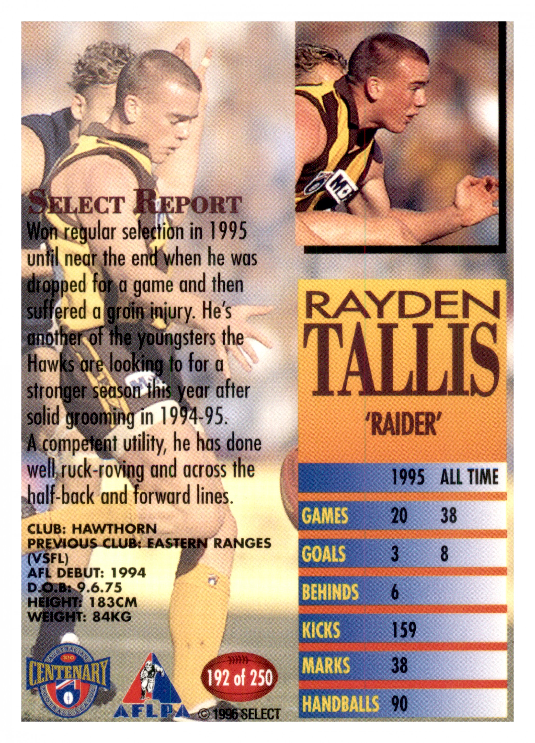 1996 AFL SELECT SERIES 1 #192 RAYDEN TALLIS - HAWTHORN HAWKS