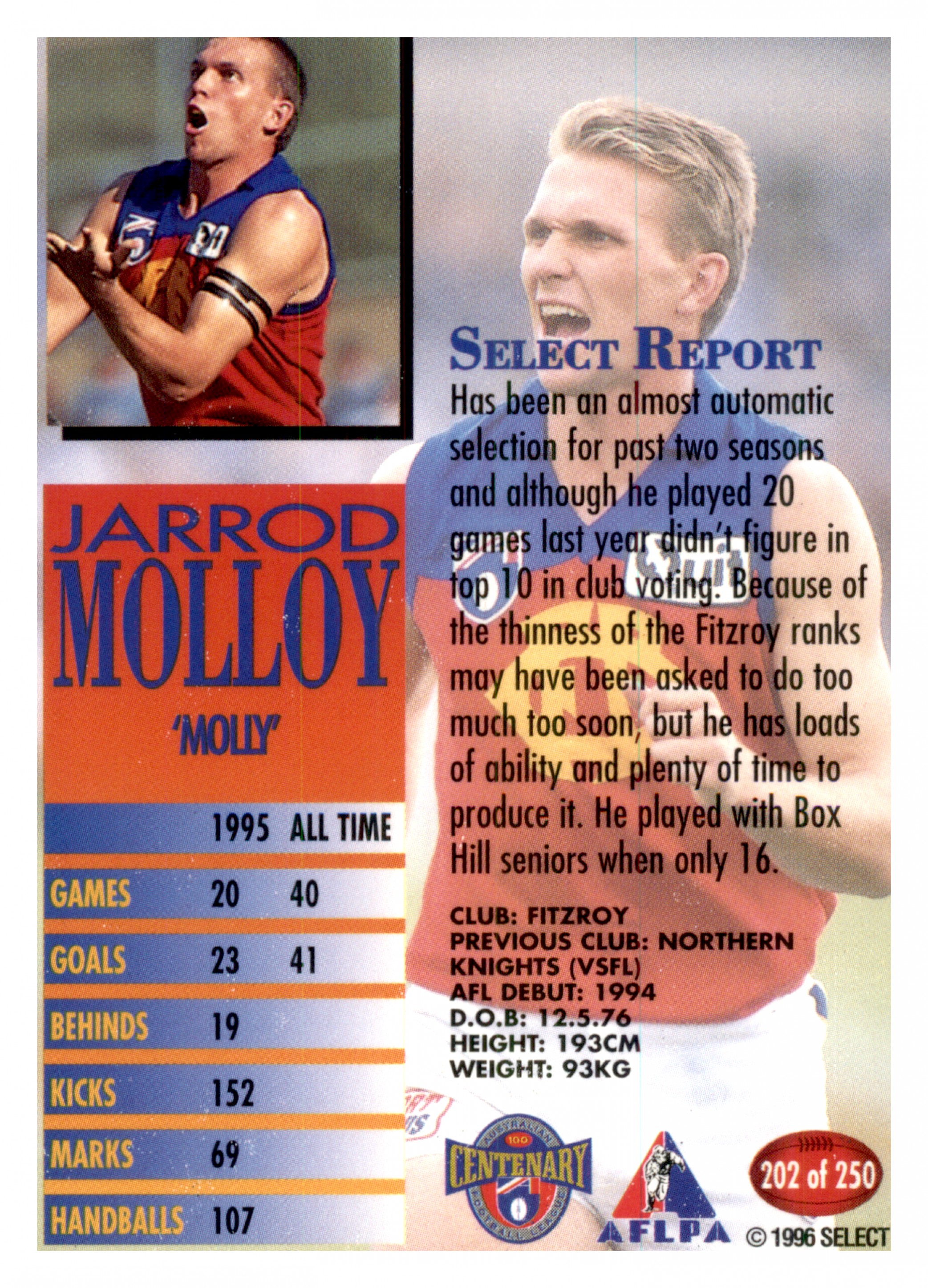 1996 AFL SELECT SERIES 1 #202 JARROD MOLLOY - FITZROY LIONS