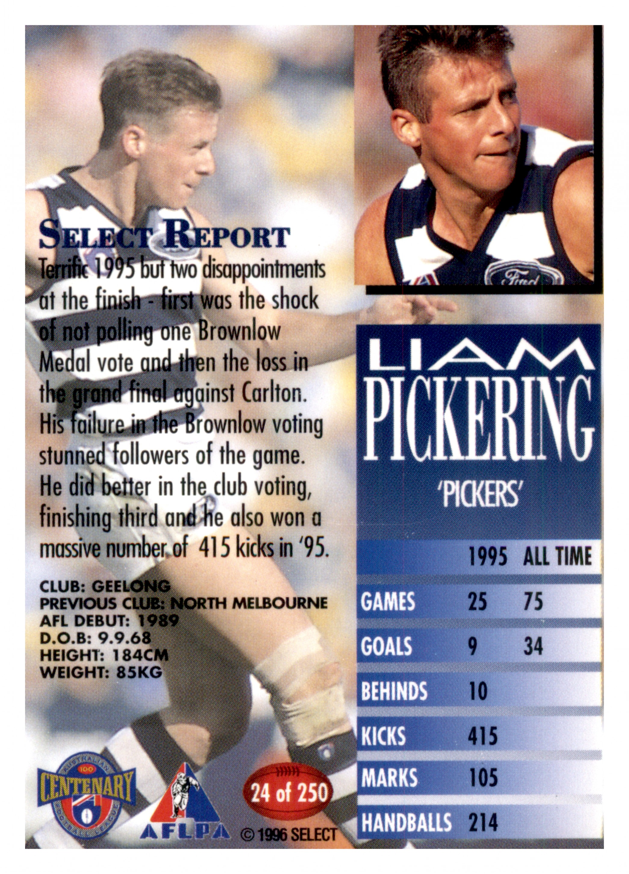 1996 AFL SELECT SERIES 1 #24 LIAM PICKERING - GEELONG CATS