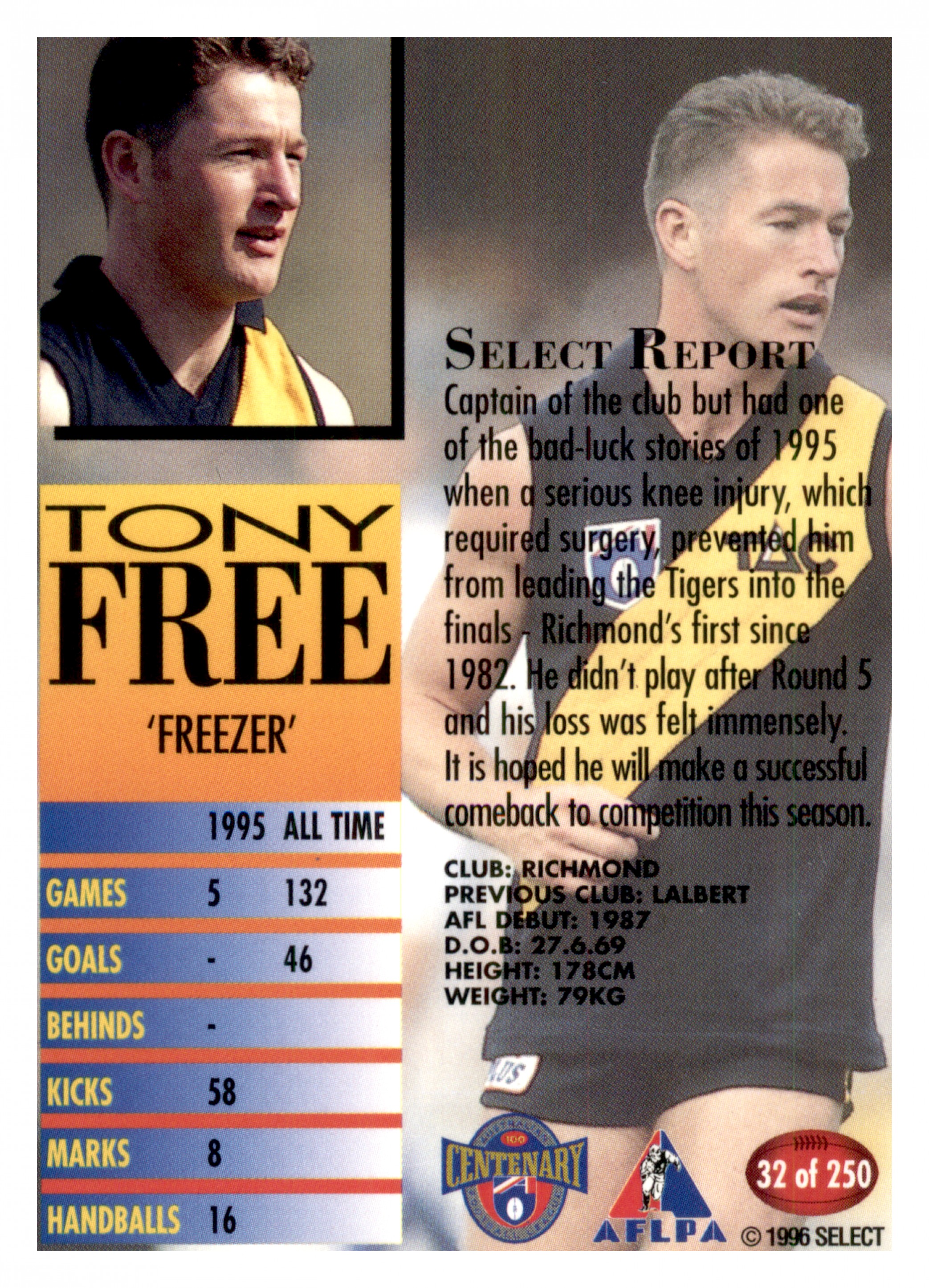1996 AFL SELECT SERIES 1 #32 TONY FREE - RICHMOND TIGERS