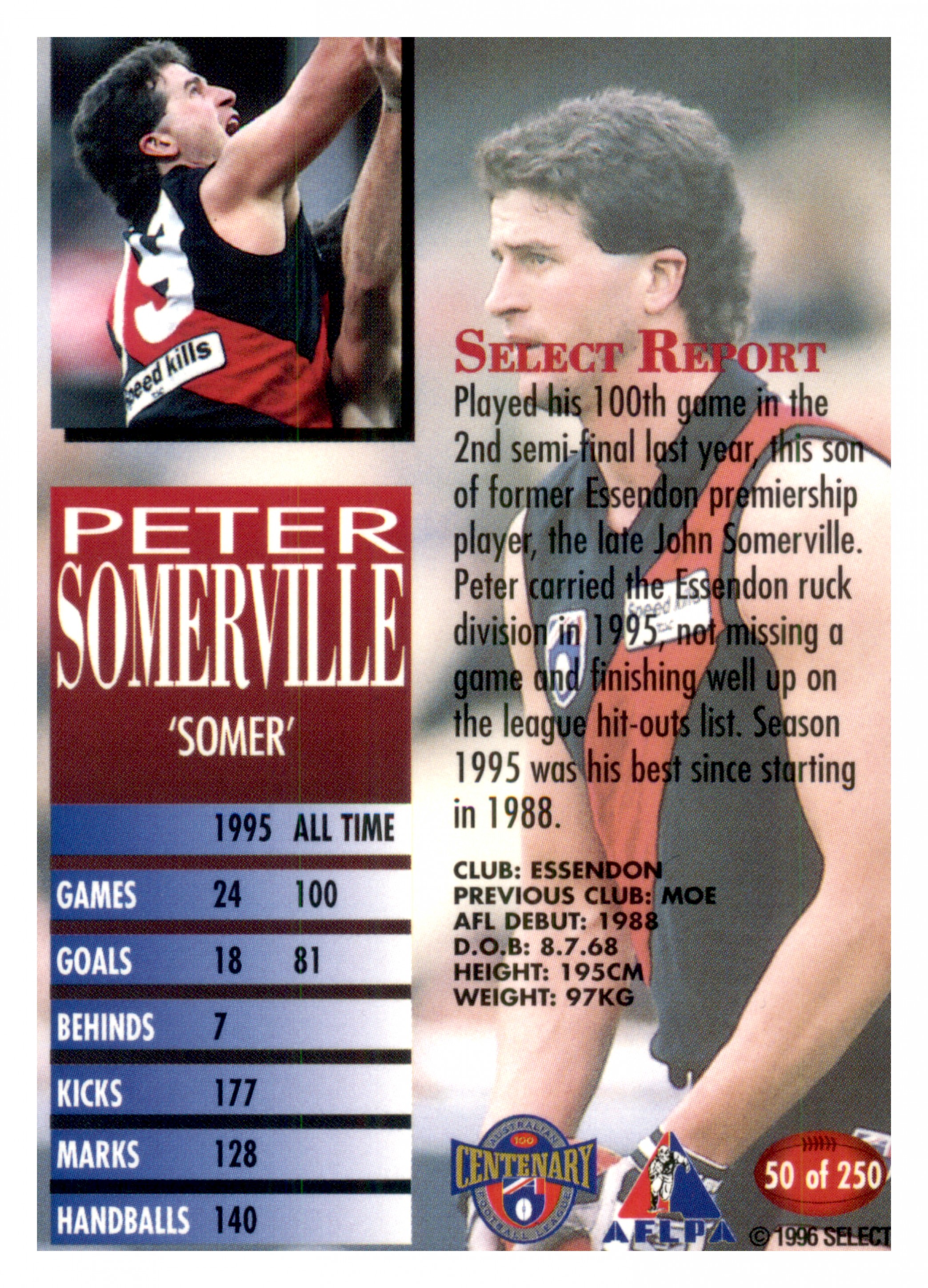 1996 AFL SELECT SERIES 1 #50 PETER SOMERVILLE - ESSENDON BOMBERS
