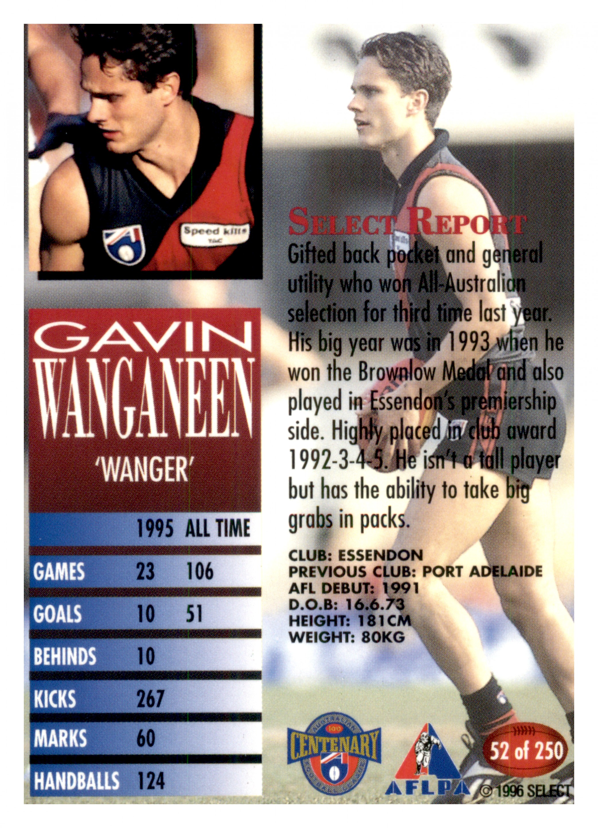 1996 AFL SELECT SERIES 1 #52 GAVIN WANGANEEN - ESSENDON BOMBERS