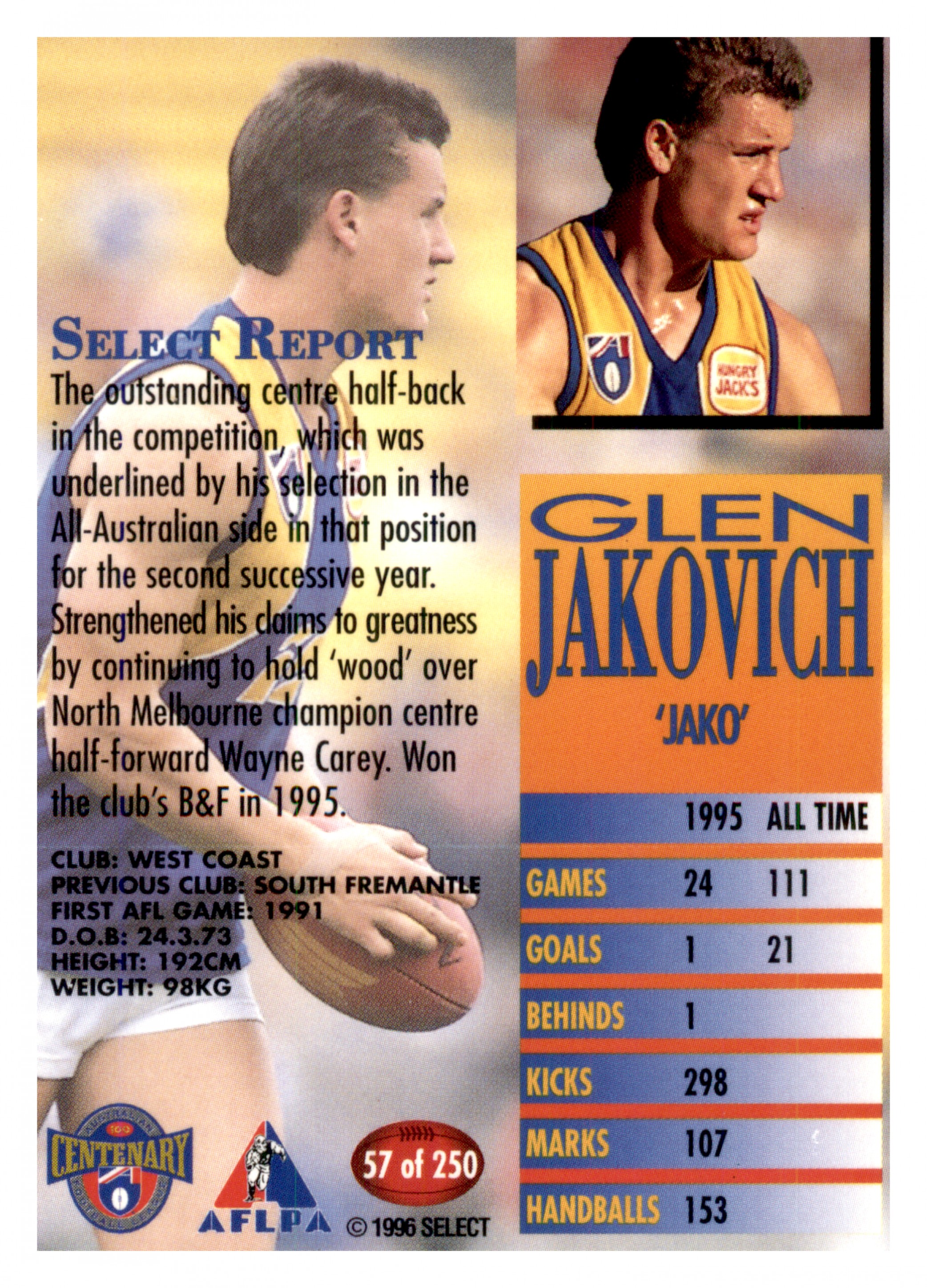 1996 AFL SELECT SERIES 1 #57 GLEN JAKOVICH - WEST COAST EAGLES