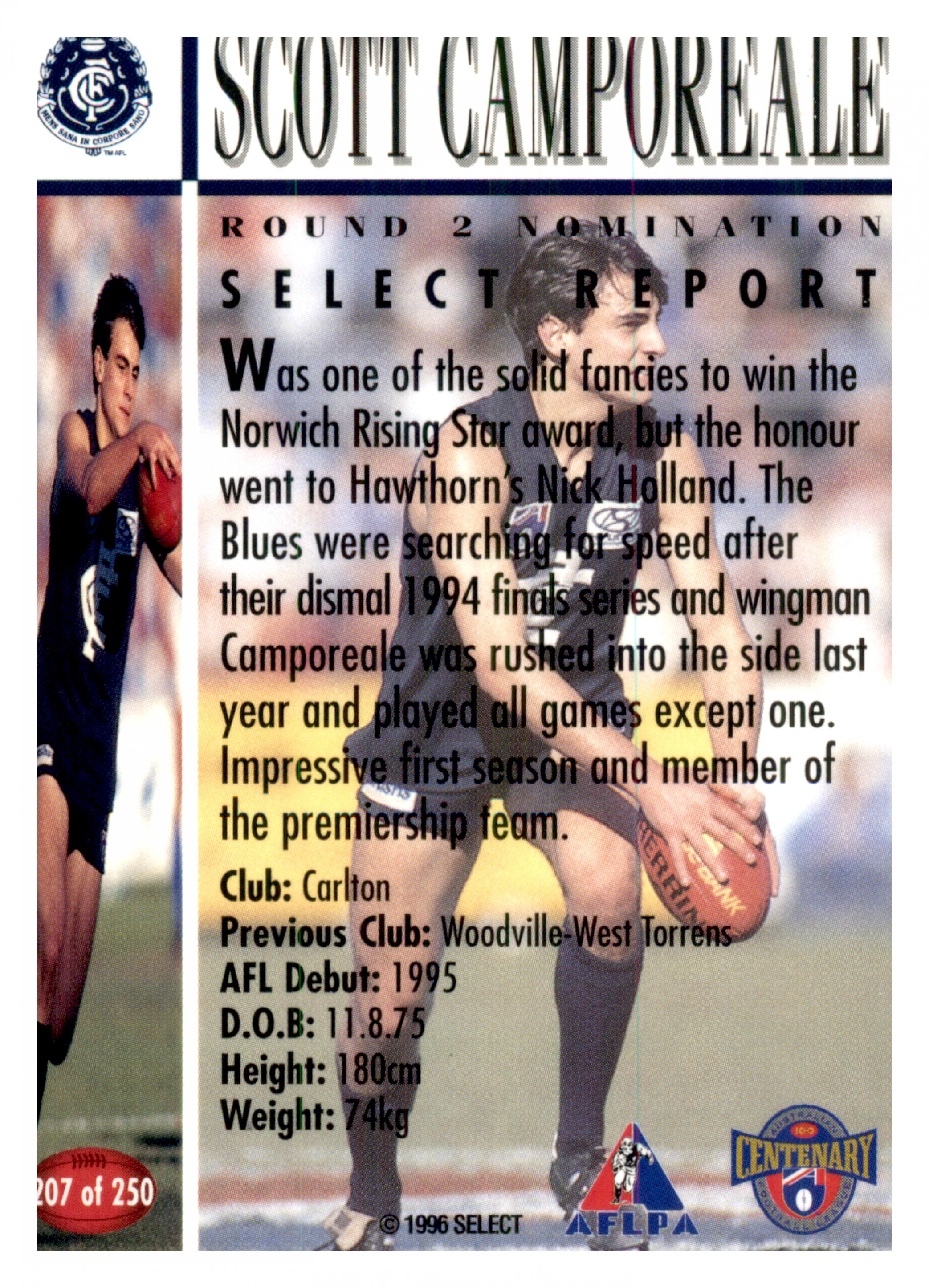 1996 AFL SELECT SERIES 1 FUTURE STAR #207 SCOTT CAMPOREALE - CARLTON BLUES