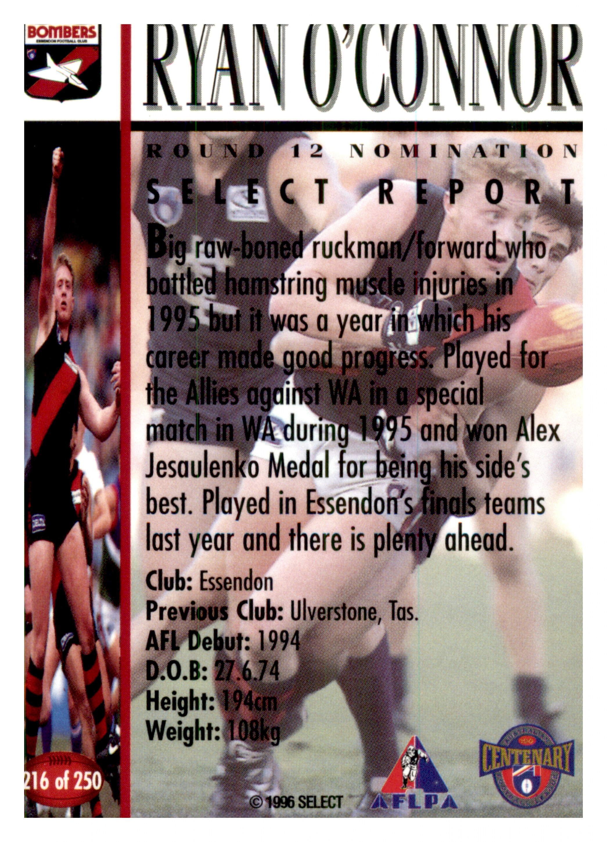 1996 AFL SELECT SERIES 1 FUTURE STAR #216 RYAN O'CONNOR - ESSENDON BOMBERS