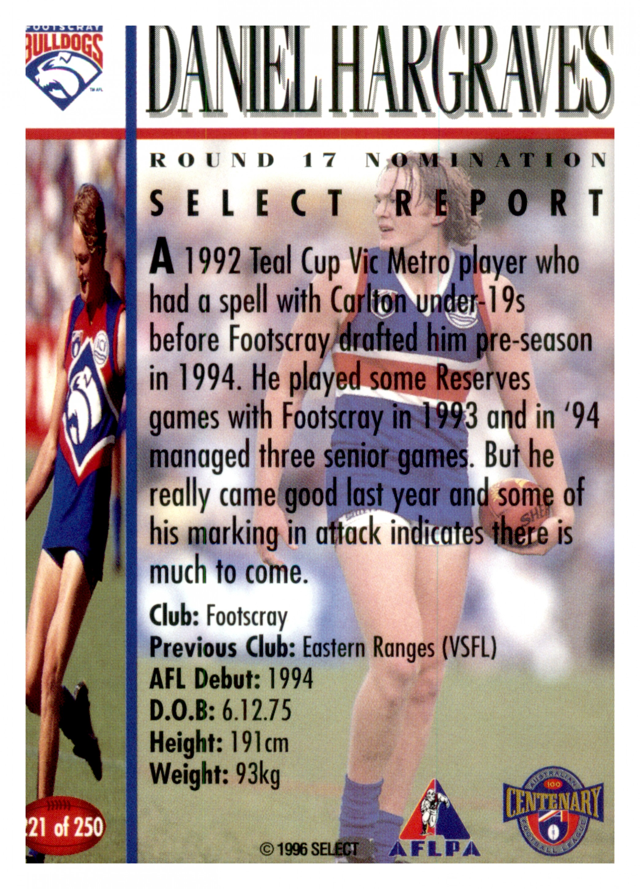 1996 AFL SELECT SERIES 1 FUTURE STAR #221 DANIEL HARGRAVES - FOOTSCRAY (WESTERN) BULLDOGS