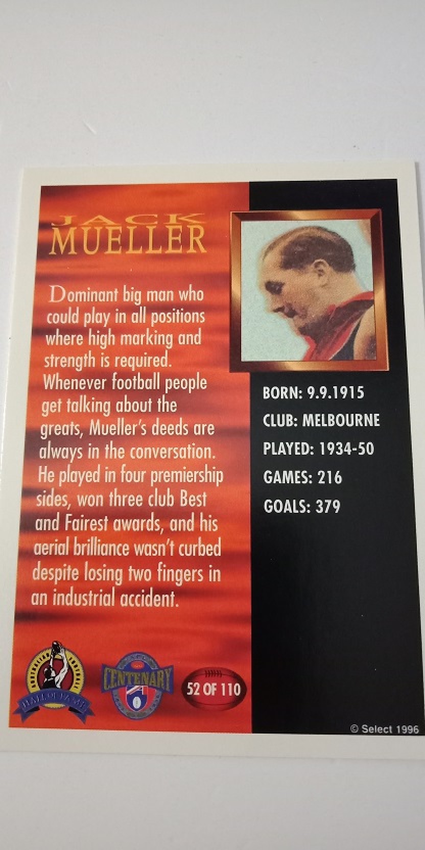 1996 SELECT AFL HALL OF FAME SERIES CARD - 52/110 JACK MUELLER MELBOURNE DEMONS