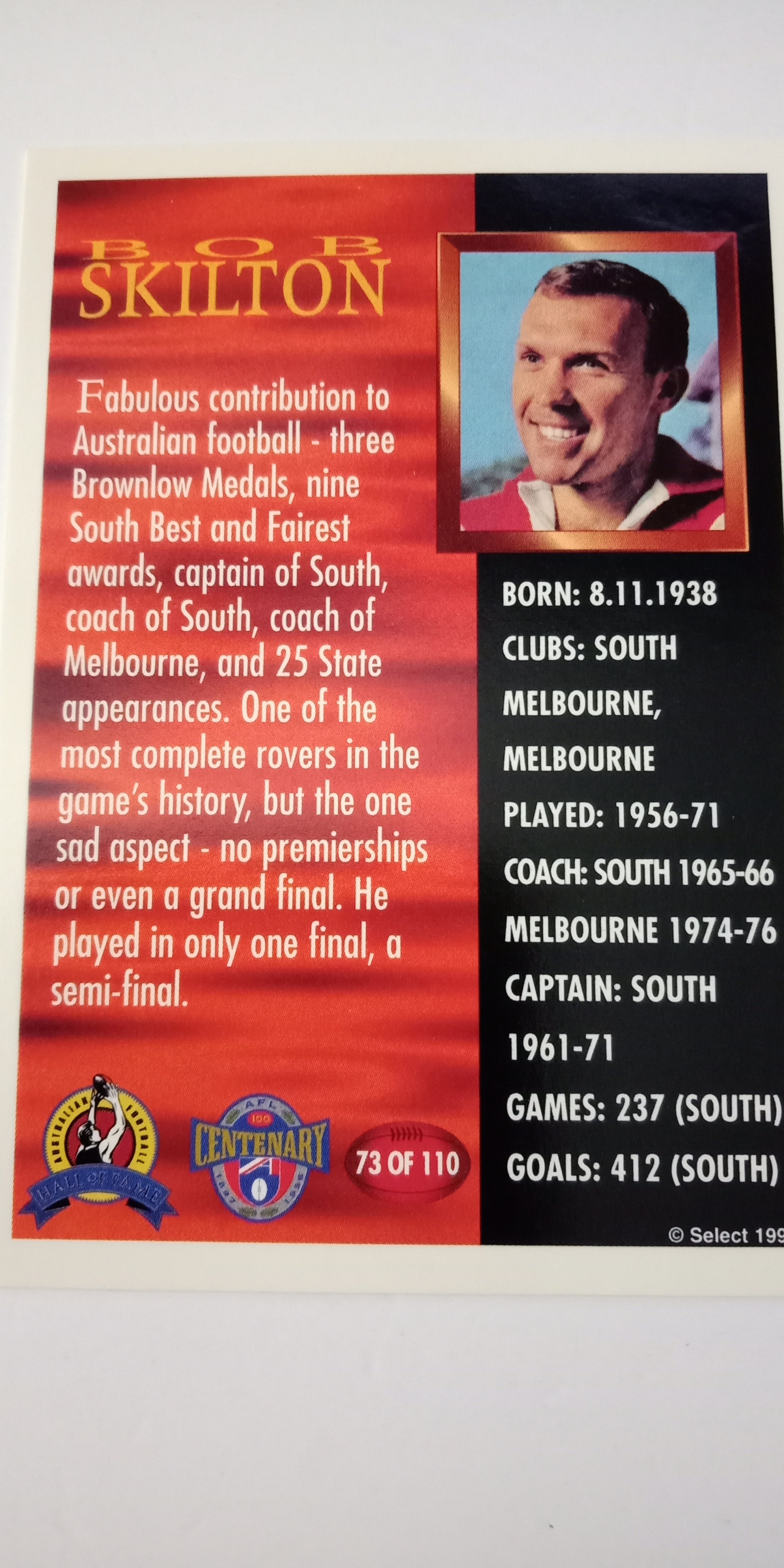 1996 SELECT AFL HALL OF FAME SERIES CARD - 73/110 BOB SKILTON SOUTH MELBOURNE