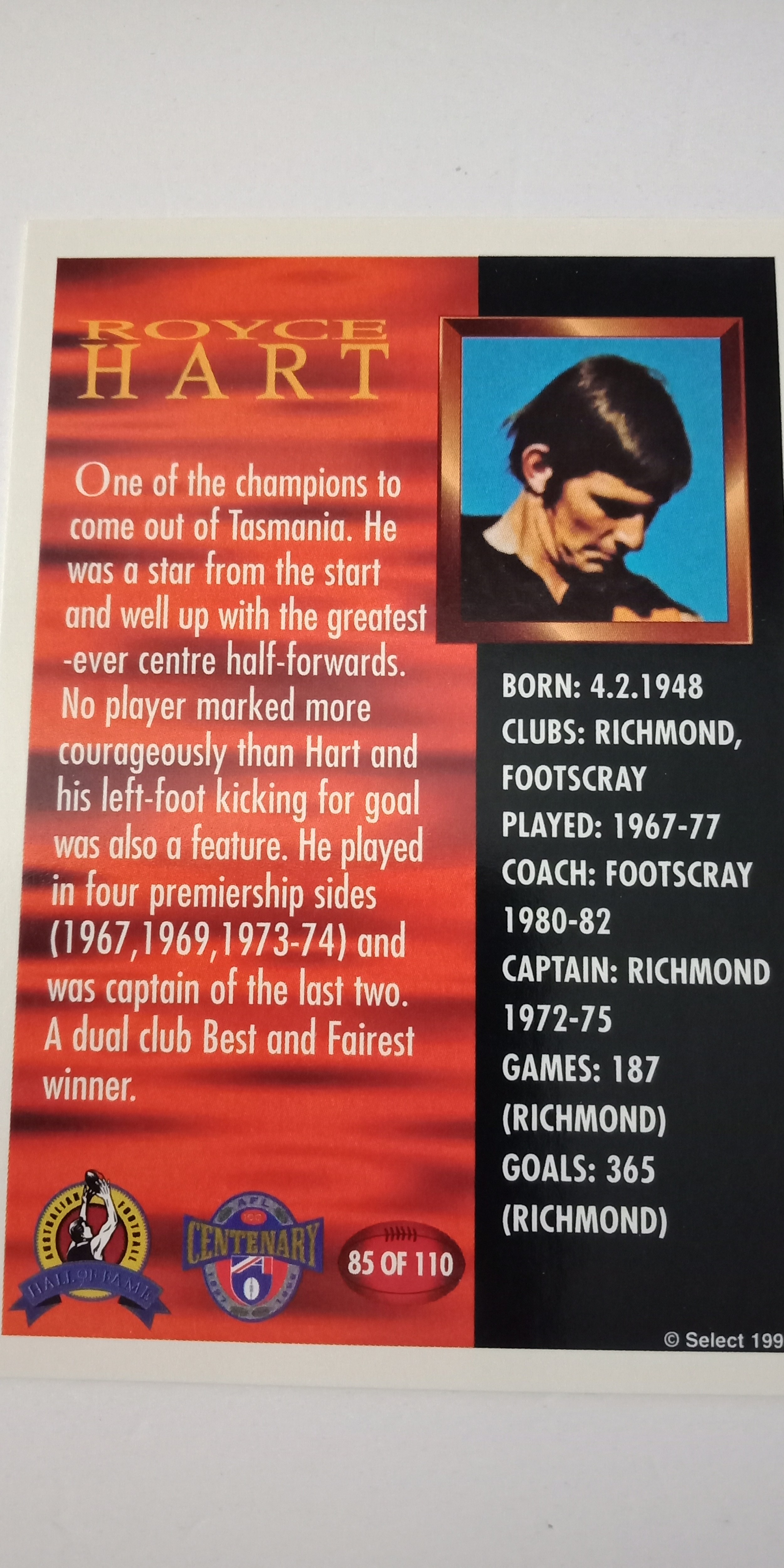 1996 SELECT AFL HALL OF FAME SERIES CARD - 85/110 ROYCE HART RICHMOND TIGERS