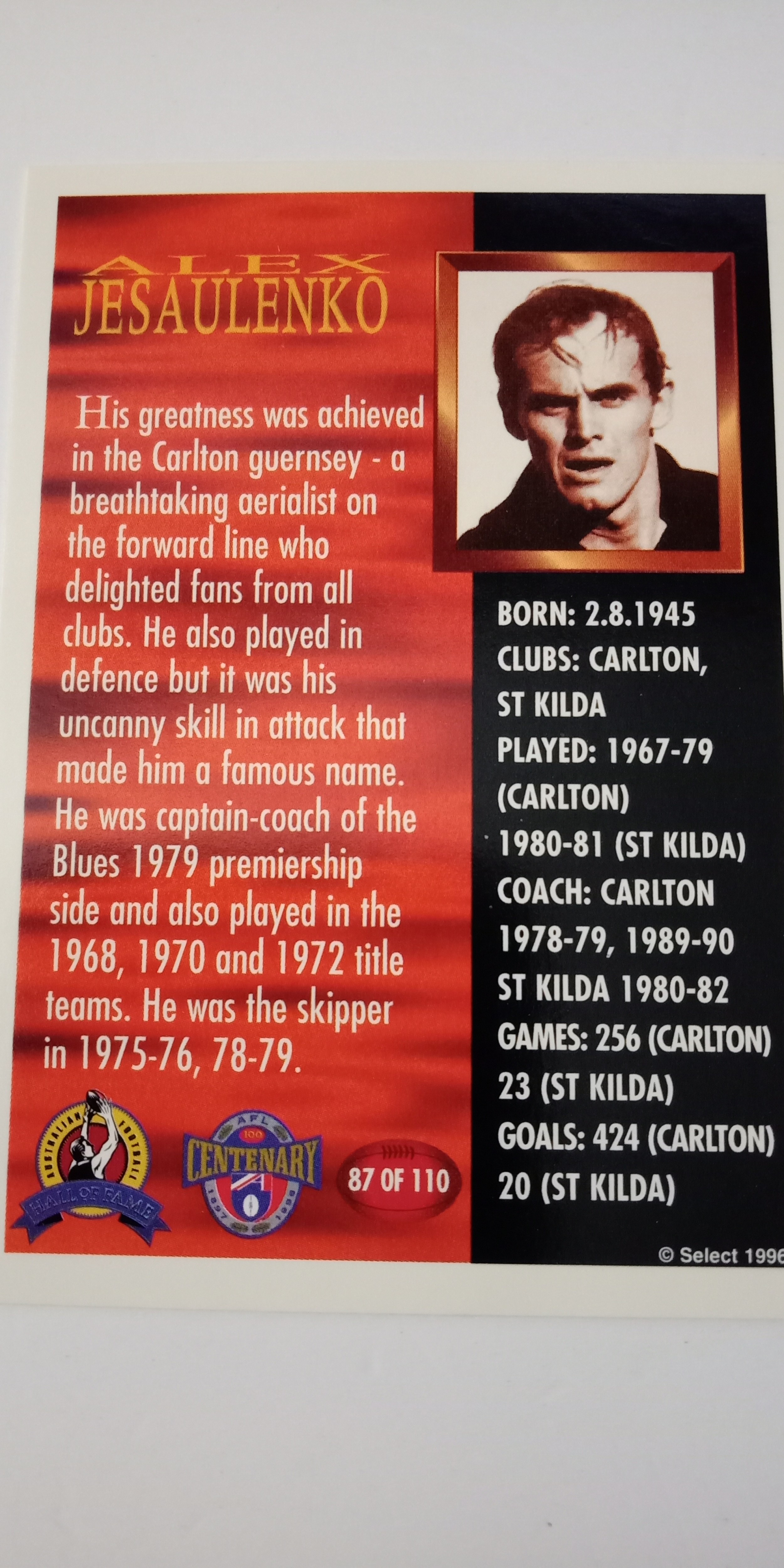 1996 SELECT AFL HALL OF FAME SERIES CARD - 87/110 ALEX JESAULENKO CARLTON BLUES / ST KILDA SAINTS