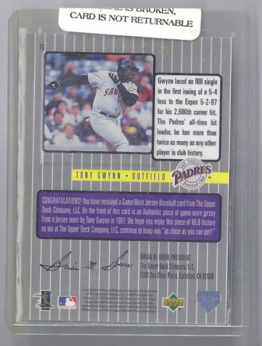 Question: http://www.ebay.com/itm/1998-Upper-Deck-A-Piece-of-the-Action-TG-Tony-Gwynn-Game-Worn-Jersey-/222600931348?hash=item33d40ca814%3Ag%3AXKYAAOSwwN5Zghho&nma=true&si=0Z61%252FNdpcQrlWIxyEwuxheAGp7A%253D&orig_cvip=true&rt=nc&_trksid=p2047675.l2557