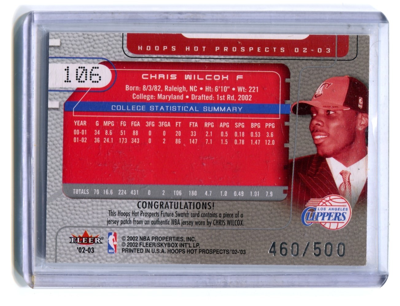 This listing is for 2002-03 Hoops Hot Prospects #106 Chris Wilcox JSY RC 3CLR Patch!! 460/500 - Los Angeles Clippers.