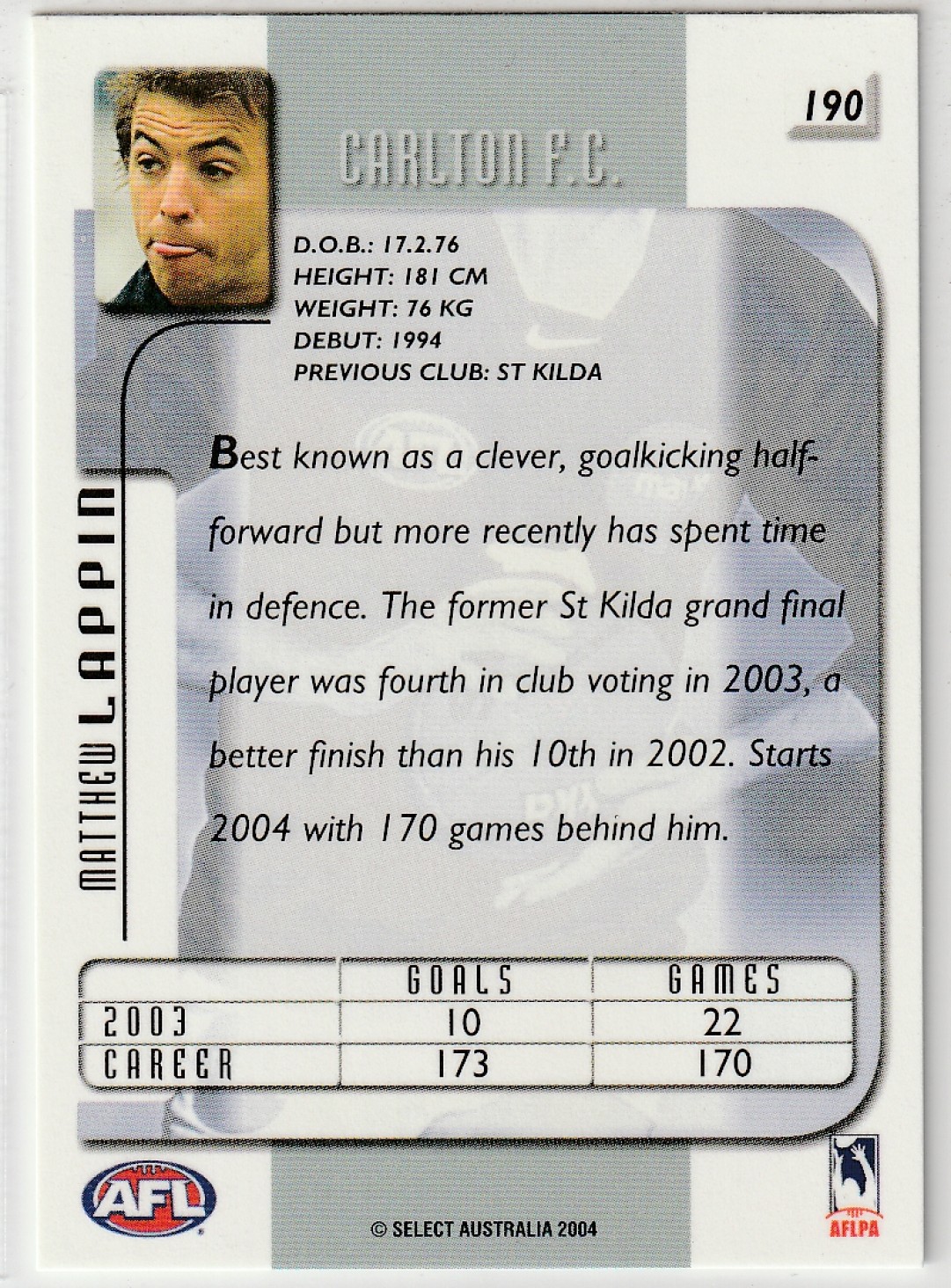 2004 SELECT CONQUEST #190 MATTHEW LAPPIN 🔥🏉 🔥💨