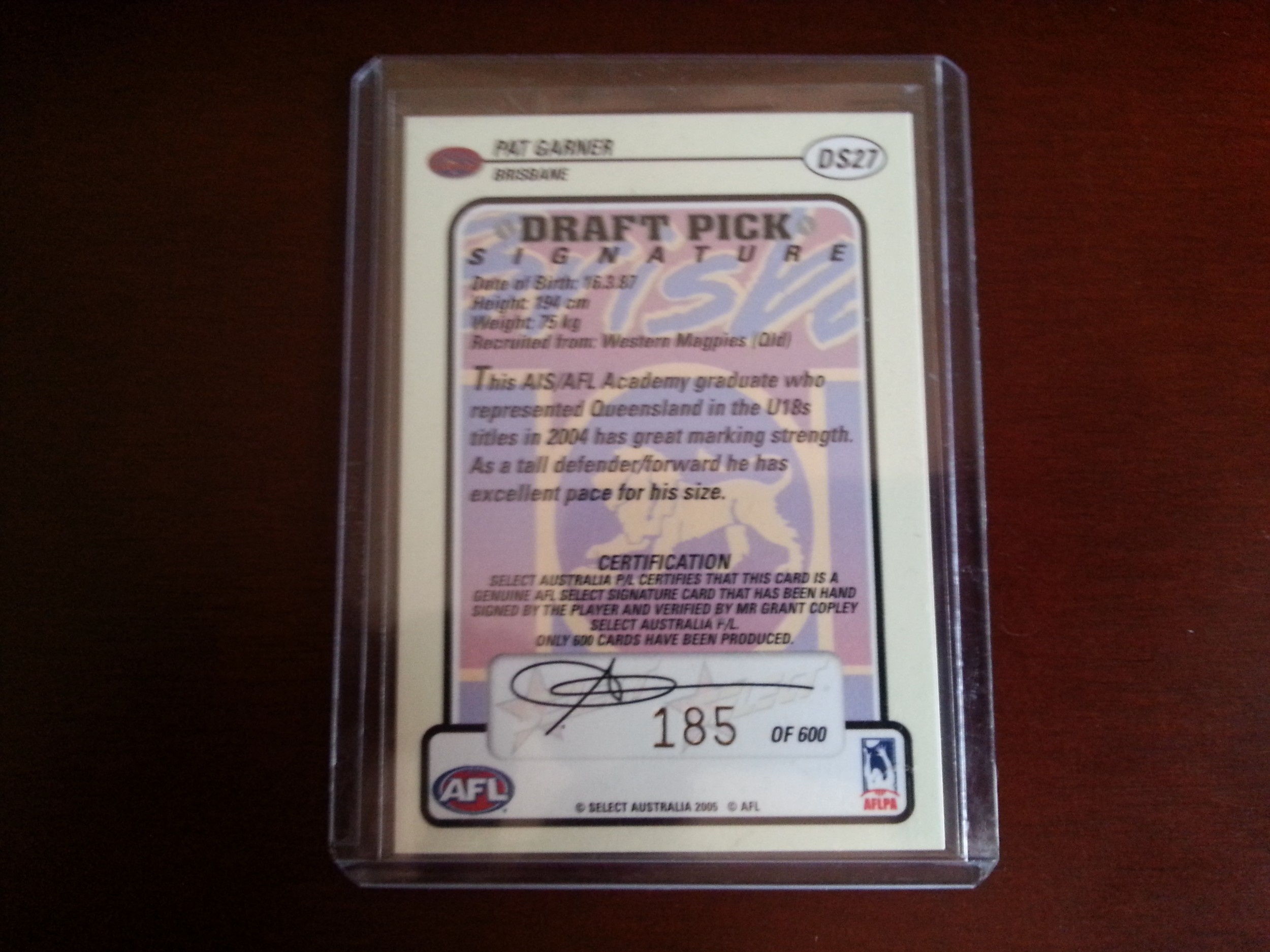 2005 SELECT AFL DYNASTY PAT GARNER BRISBANE LIONS DRAFT PICK SIGNATURE #185/600