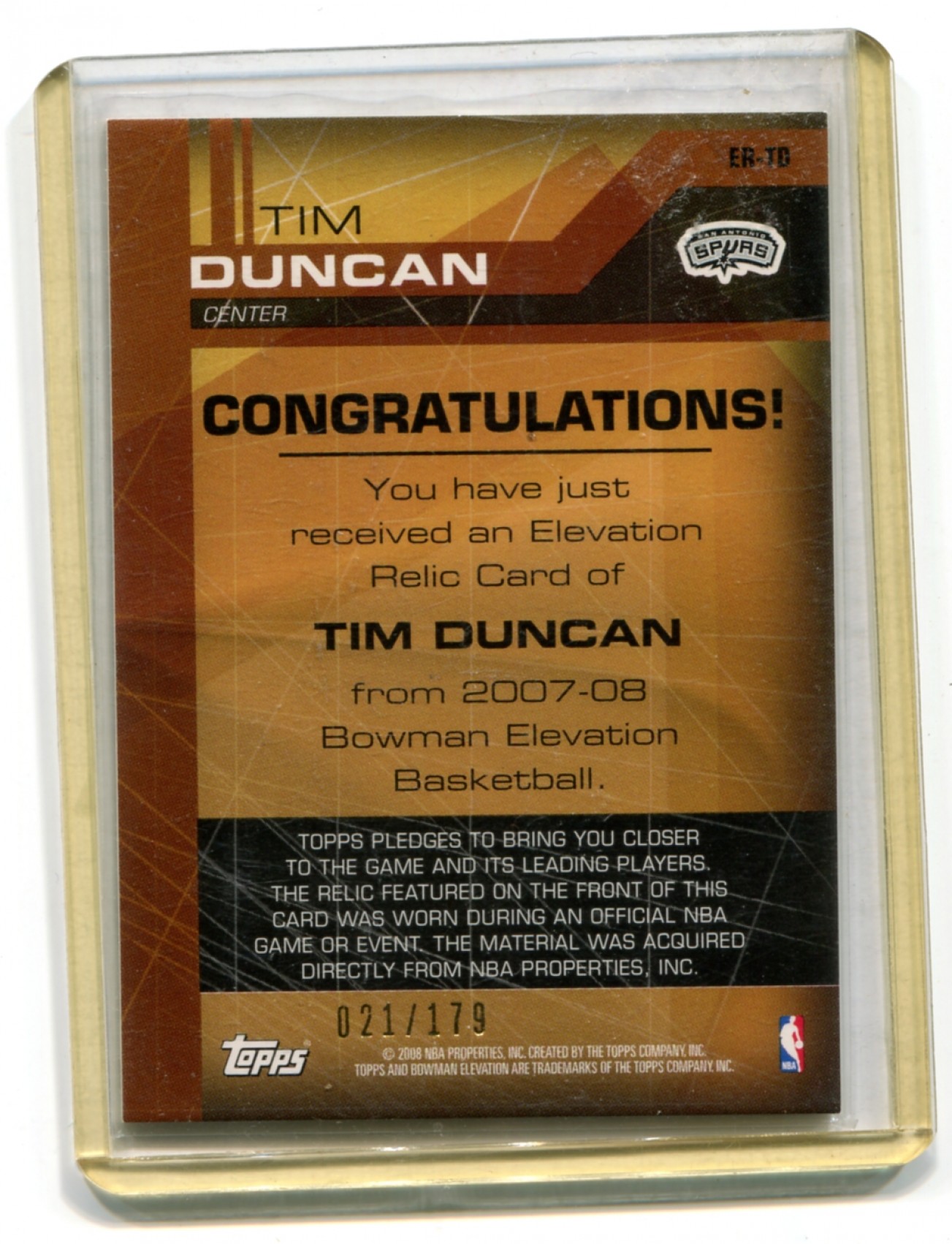 2007-08 Bowman Elevation Relics #TD Tim Duncan 021/179 - JERSEY NUMBERED - San Antonio Spurs