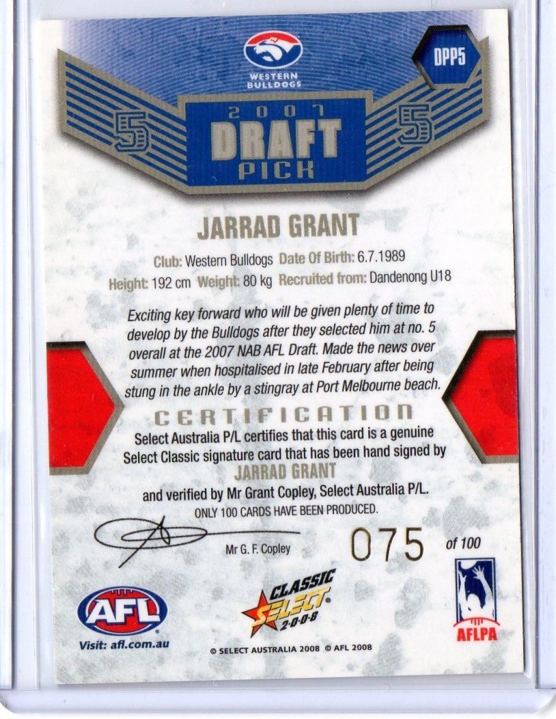 Item: 2008 Classic Draft Pick Platinum Signature DPP5 Jarrad Grant 075 of 100 - Western Bulldogs