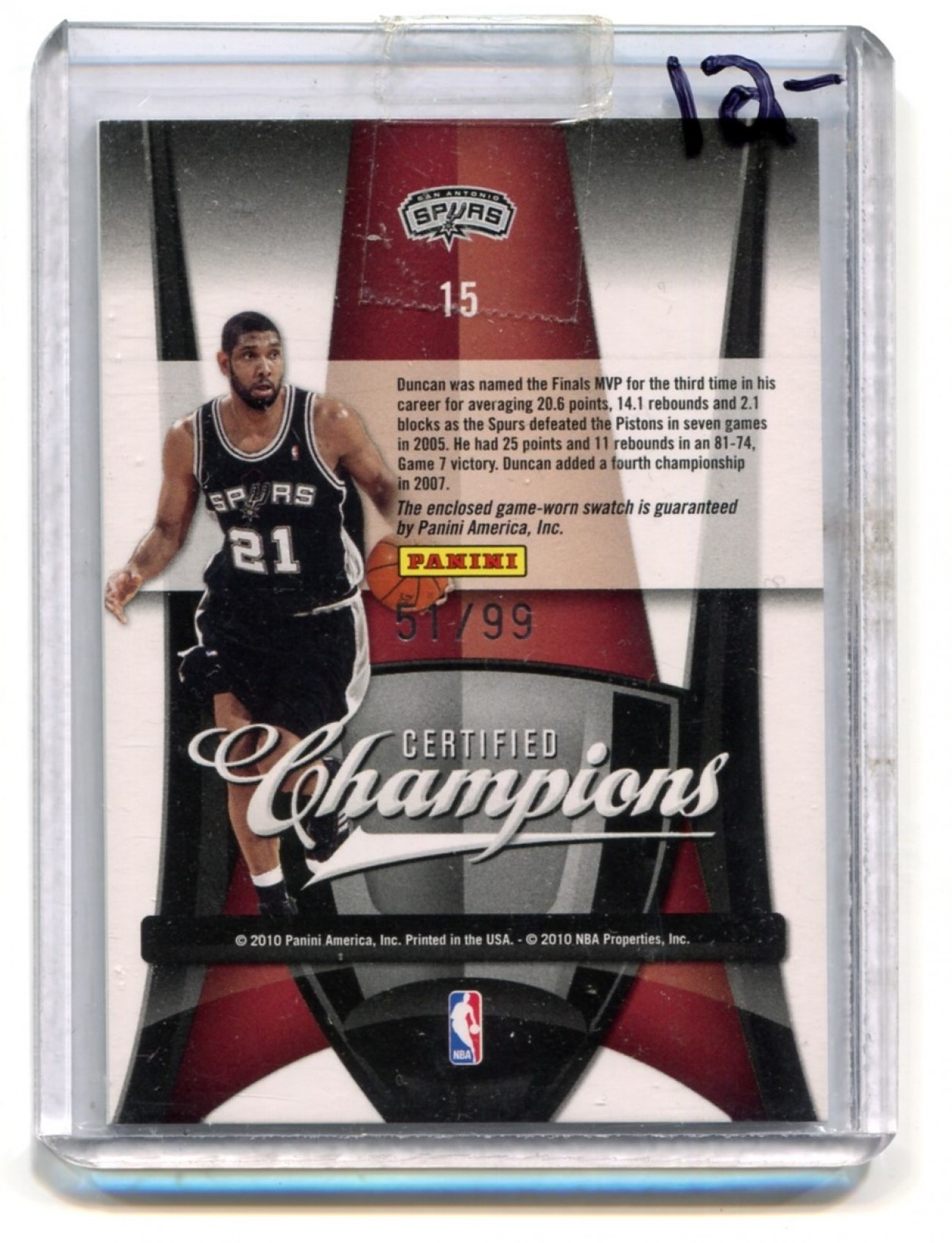 This listing is for 2009-10 Certified Champions Materials #15 Tim Duncan 51/99 - San Antonio Spurs.