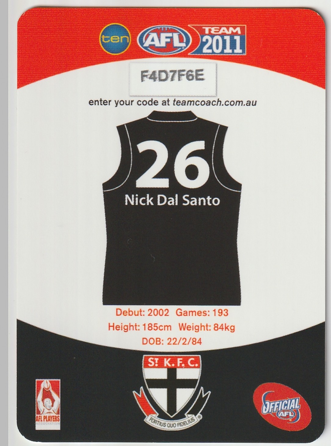 2011 TEAMCOACH SILVER 97. NICK DAL SANTO πβ‘π Silver Code Cardπππ