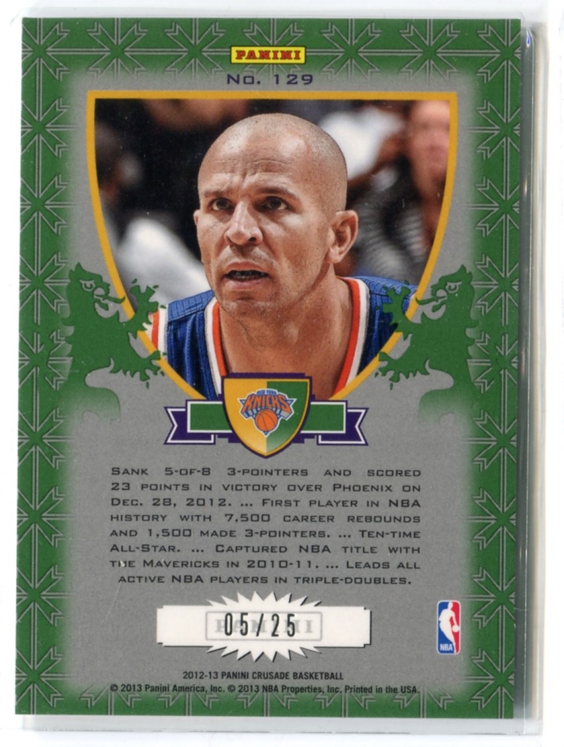 This listing is for2012-13 Panini Crusade Insert Green #129 Jason Kidd 05/25 - JERSEY NUMBERED!! - New York Knicks.