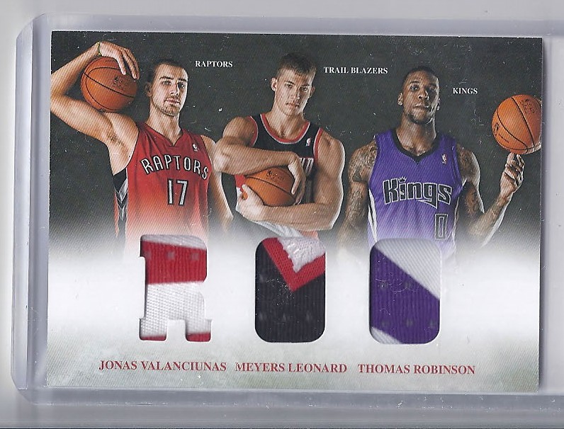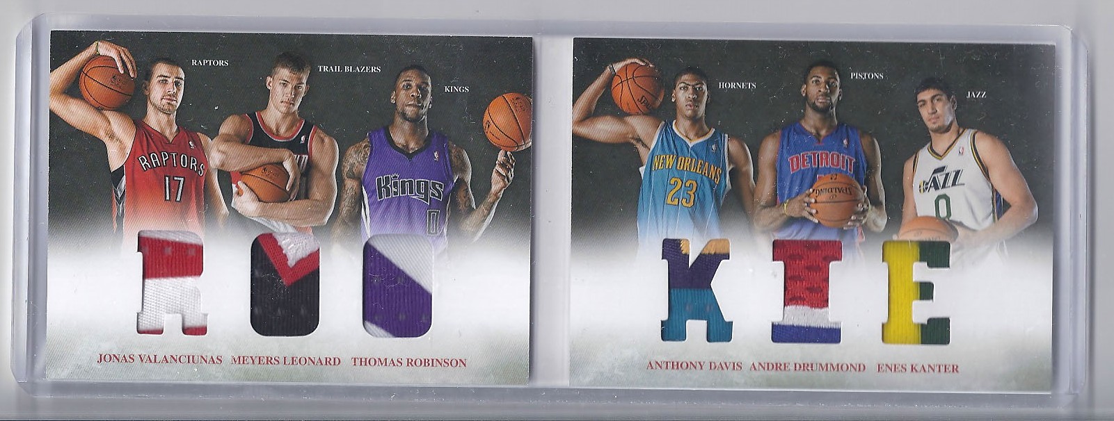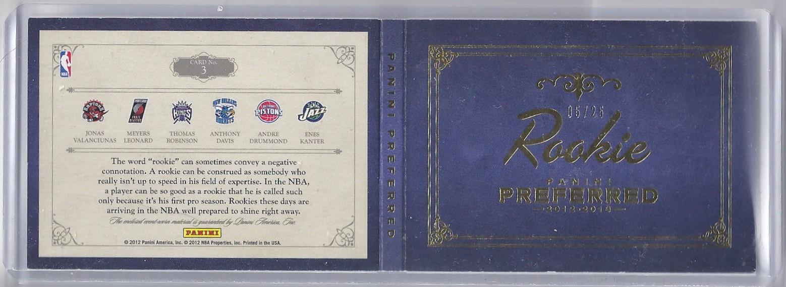 This listing is for 2012-13 Panini Preferred Rookie Memorabilia Prime #3 Jonas Valanciunas / Meyers Leonard / Thomas Robinson / Anthony Davis / Enes Kanter / Andre Drummond numbered 05/25.