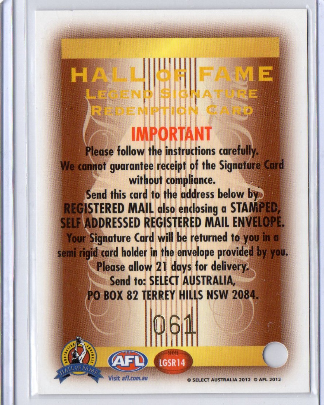 Up for grabs is an AFL card that has been pulled from a collector's personal collection for us to sell on their behalf.