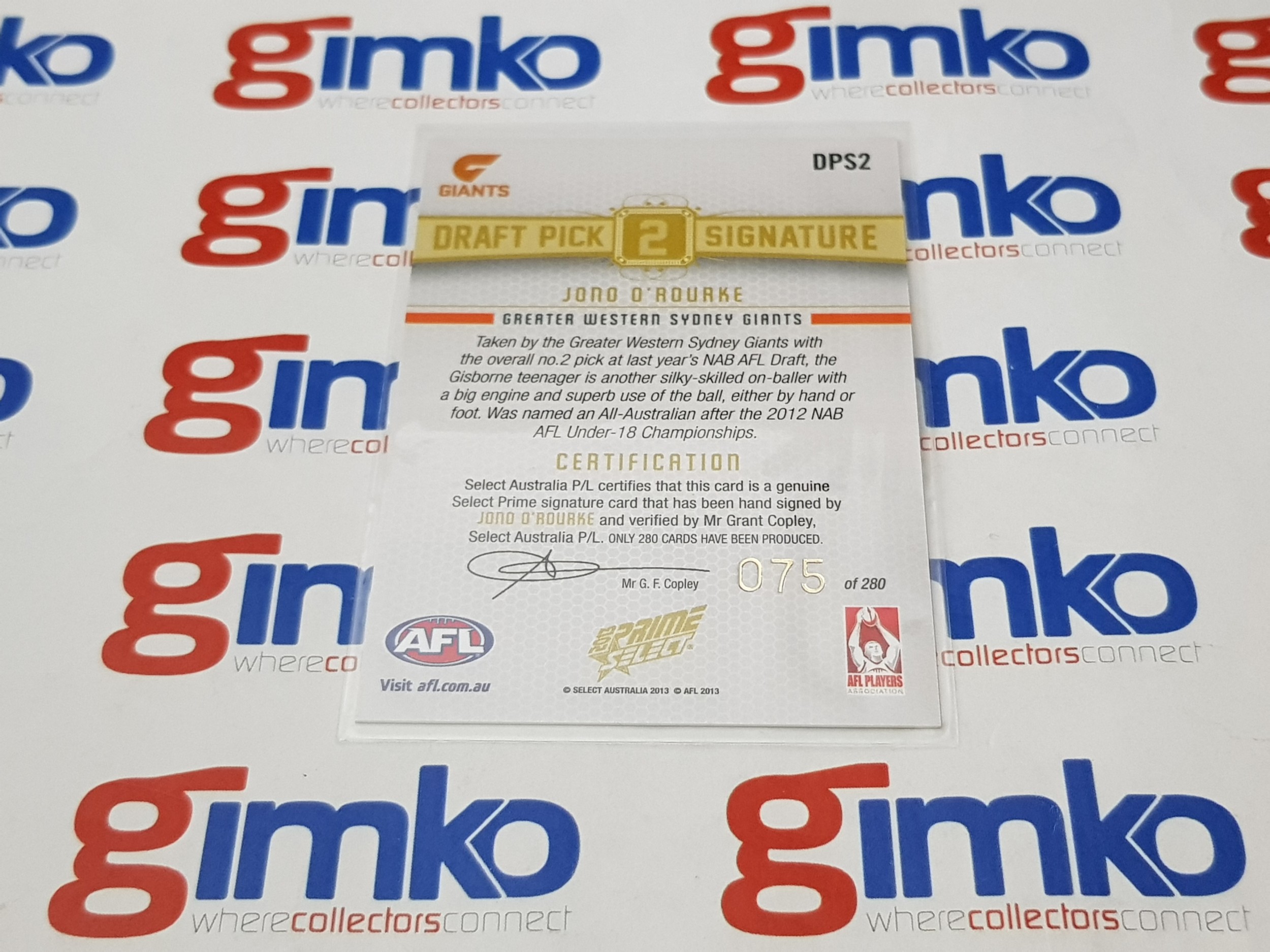 2013 AFL SELECT PRIME DRAFT PICK SIGNATURE DPS2 JONO O'ROURKE - GWS GIANTS / HAWTHORN HAWKS #075/280