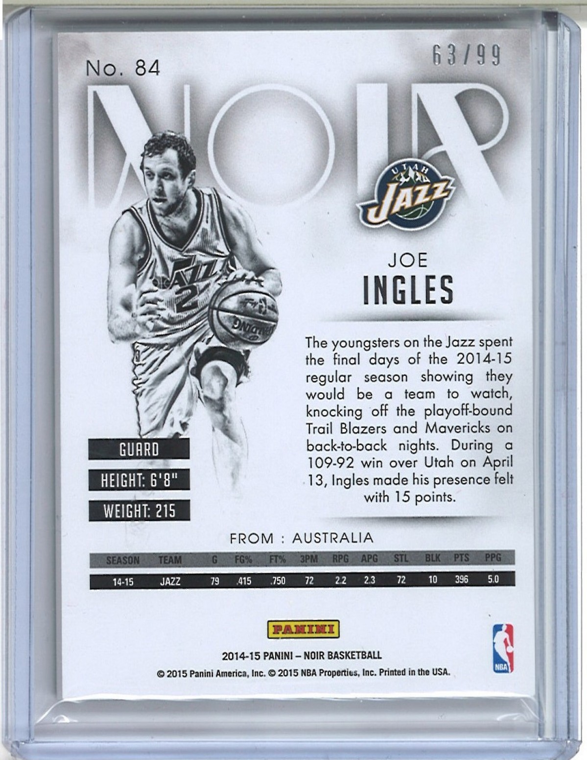 2014-15 PANINI NOIR #84 - B&W - JOE INGLES RC /99