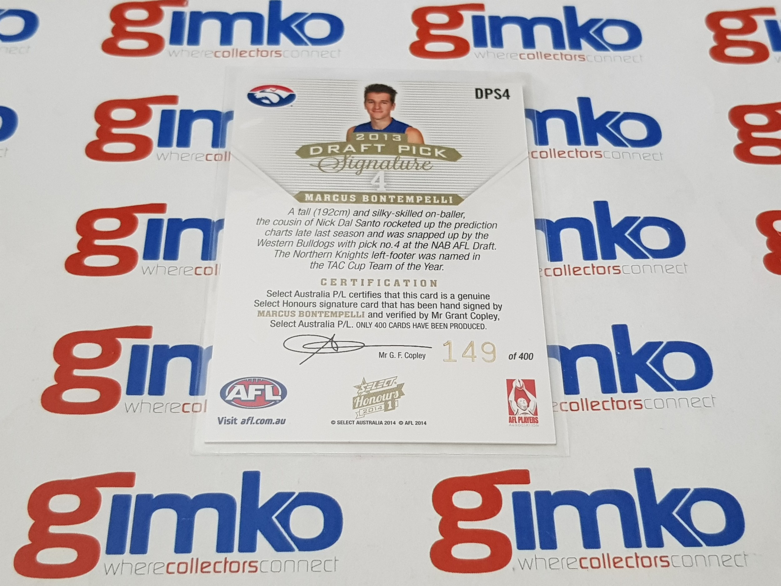 2014 AFL SELECT HONOURS DRAFT PICK SIGNATURE DPS4 MARCUS BONTEMPELLI - WESTERN BULLDOGS #149/400