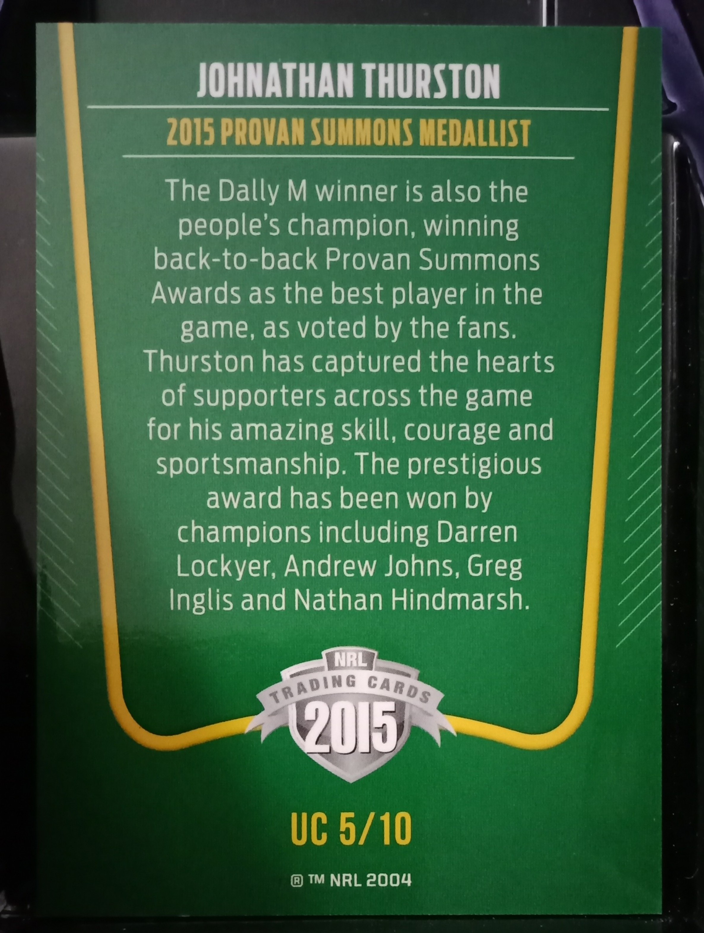 2015 NRL ESP THE ULTIMATE COLLECTION TRADING CARD - UC5/10 JOHNATHAN THURSTON PROVAN SUMMONS MEDALLIST