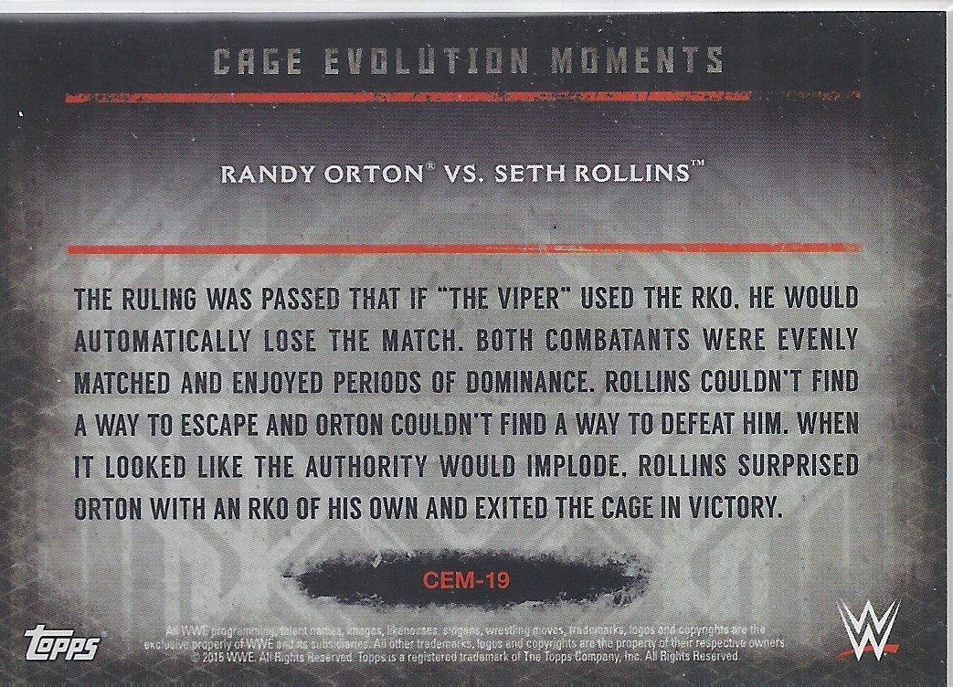 2015 TOPPS WWE UNDISPUTED Cage Evolution Moments Card CEM-19 RANDY ORTON Vs SETH ROLLINS