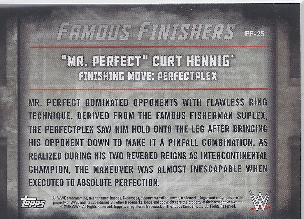 2015 TOPPS WWE UNDISPUTED Famous Finishers BLACK PARALLEL Card FF-25 MR PERFECT CURT HENNIG PERFECTPLEX 30/99