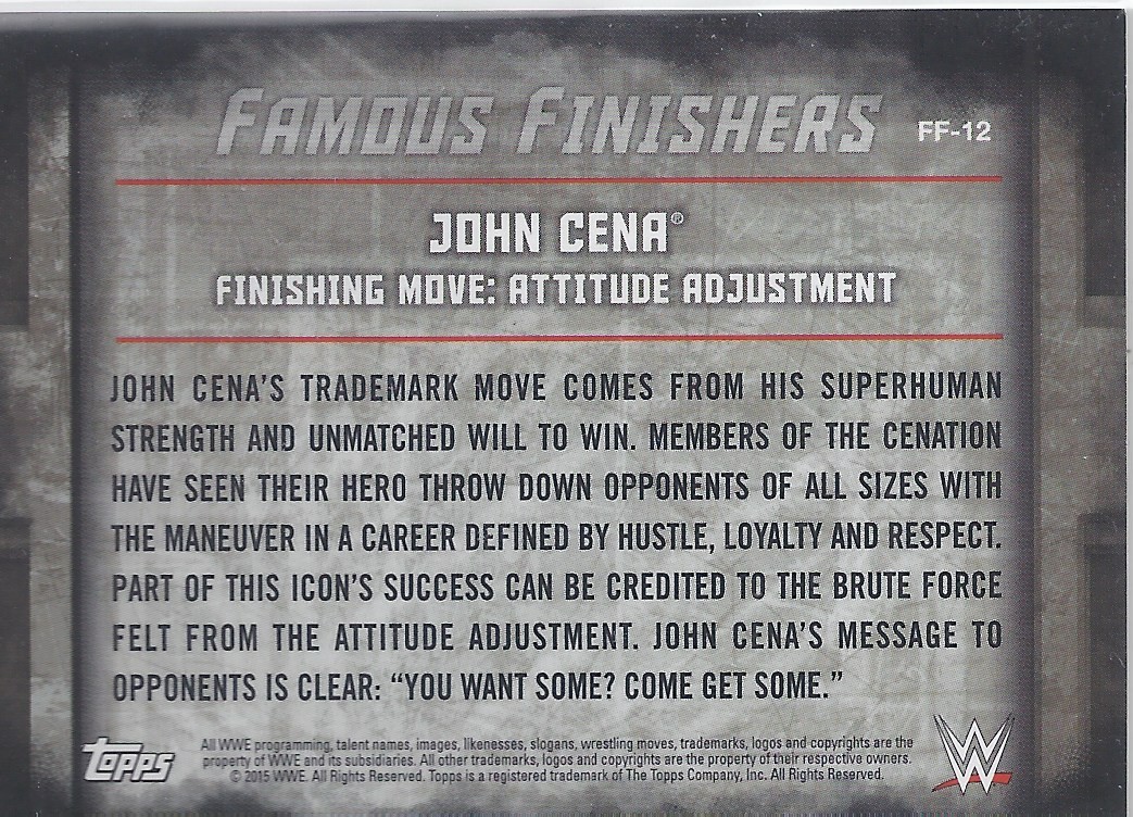 2015 TOPPS WWE UNDISPUTED Famous Finishers PURPLE PARALLEL Card FF-12 JOHN CENA ATTITUDE ADJUSTMENT 07/50