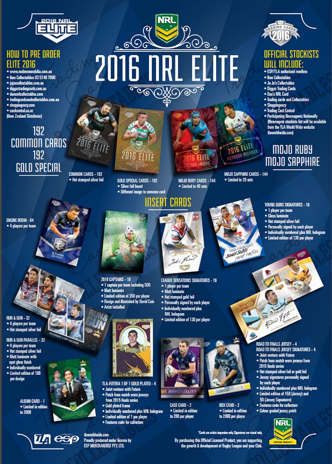 - The match worn Road To the Finals Jersey cards are back limited to 150 unsigned and 50 signed. This year we have joint ventured with Futera to produce these cards, we have therefore managed to improve the quality and design of the set and we have now included Code for Collector on the back of each card. The individual code on the back of each card will open up to NRL cards collectors a world of information relating to their individual cards including detail on where on the match worn jersey patch came from that’s featured in their card, in addition each card will be pre Colour Graded details of which will be recorded on line. All this information will be able from the Futera website which you can link to from the TLA World Wide web page, as per 2015 these cards will be redeemed.