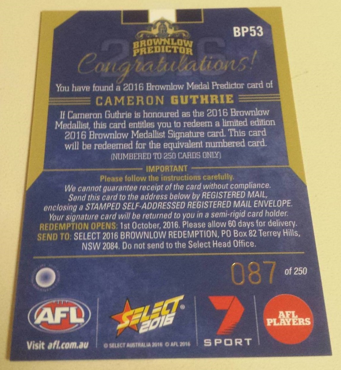 Item: 2016 Select AFL Footy Stars Brownlow Predictor BP53 Cameron Guthrie - Geelong Cats #087