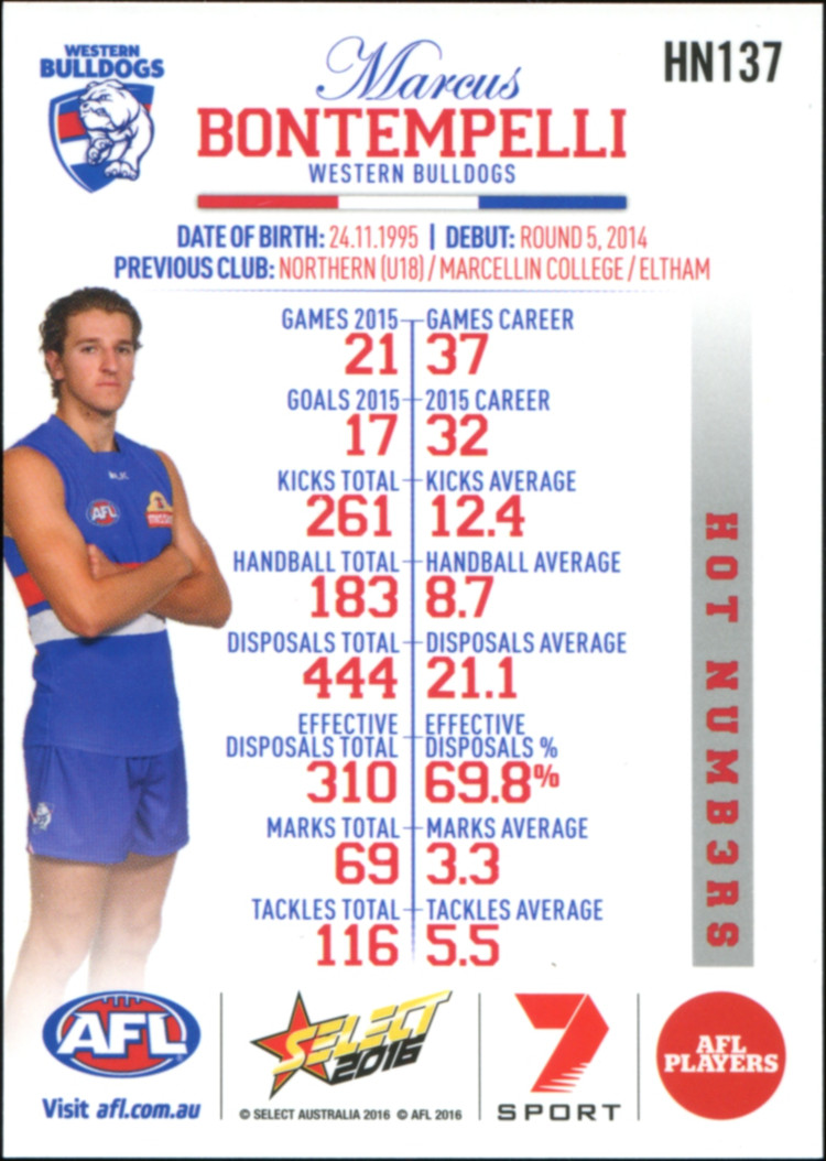 2016 Select AFL Footy Stars Hot Numbers HN137 Marcus Bontempelli Western Bulldogs