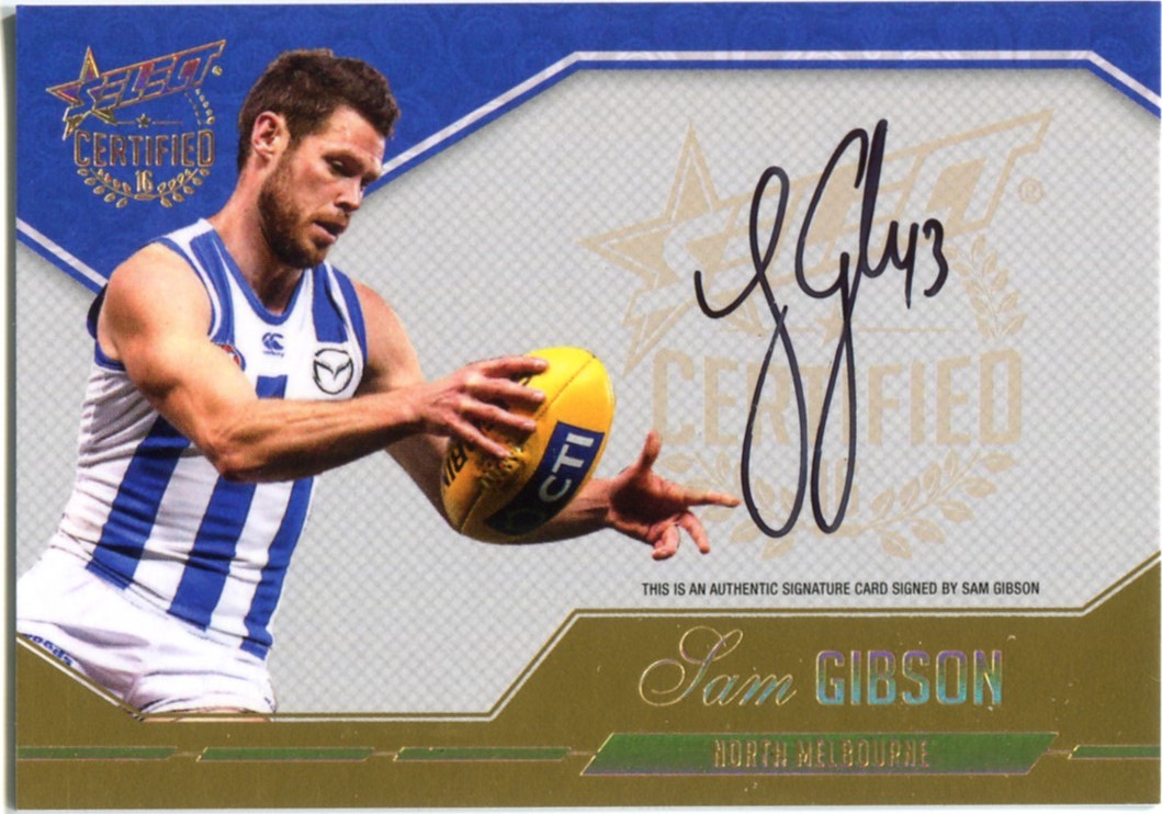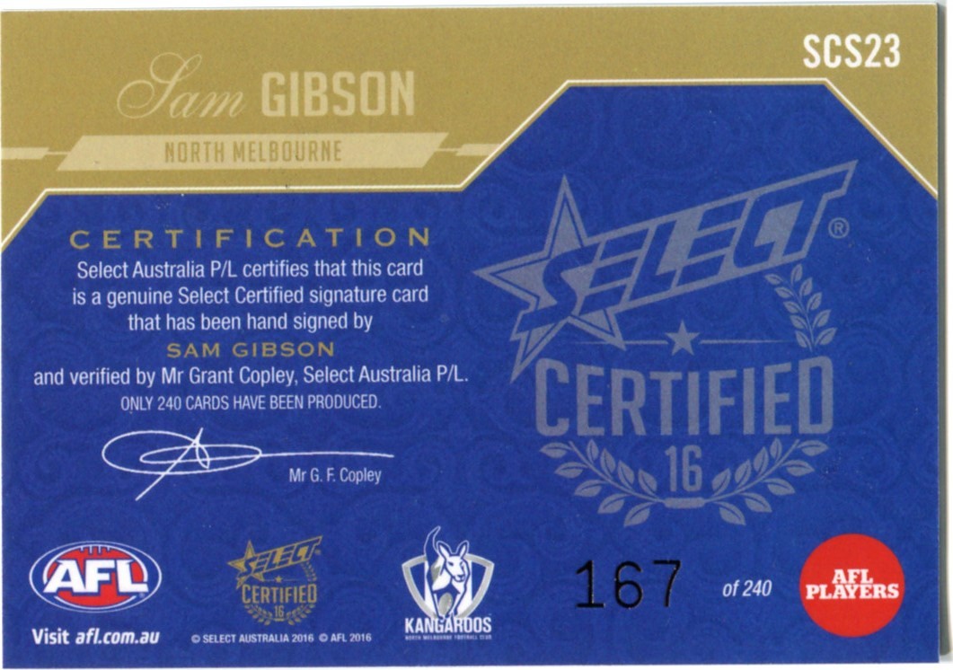 Item: 2016 Select Certified AFL Certified Signatures SCS23 Sam Gibson 167/240 - North Melbourne Kangaroos