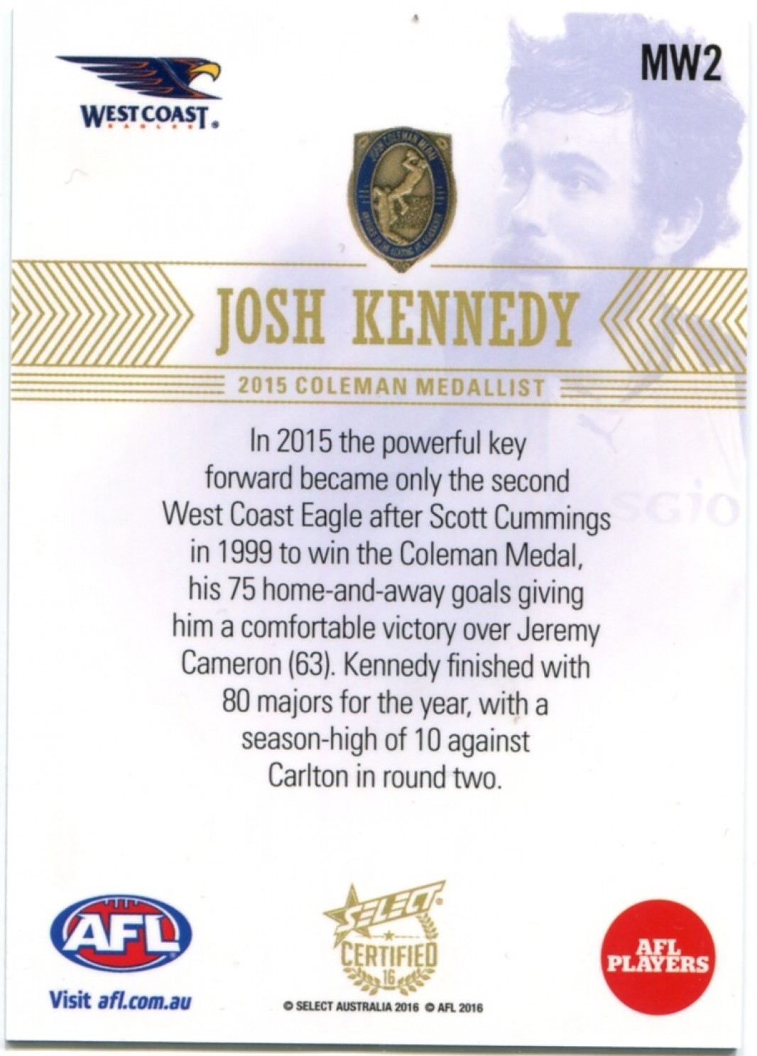 2016 Select Certified AFL Medal Winner MW2 Josh Kennedy (Coleman Medal) - West Coast Eagles