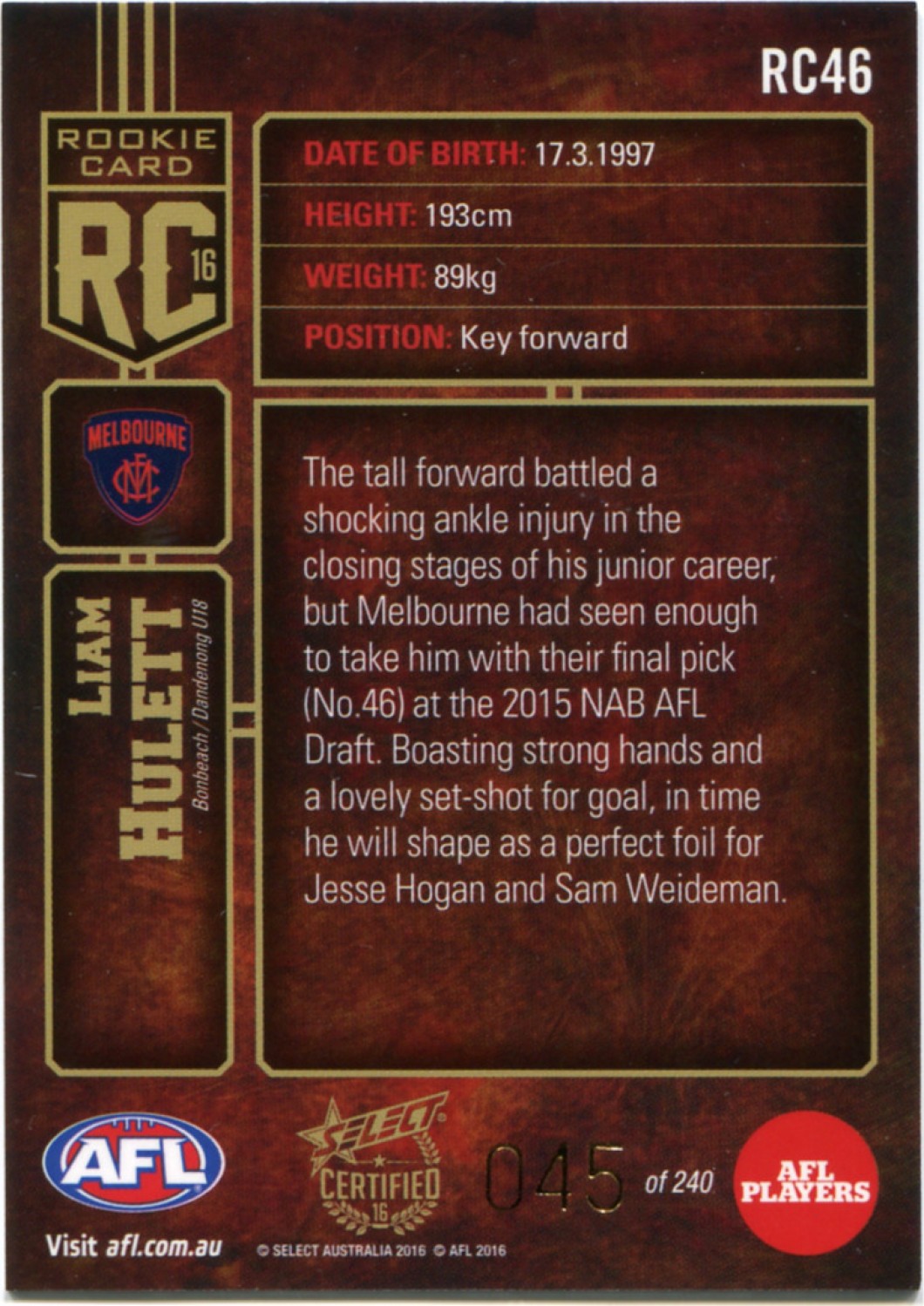 Item: 2016 Select Certified AFL Rookie Card RC46 Liam Hulett 045/240 - Melbourne Demons
