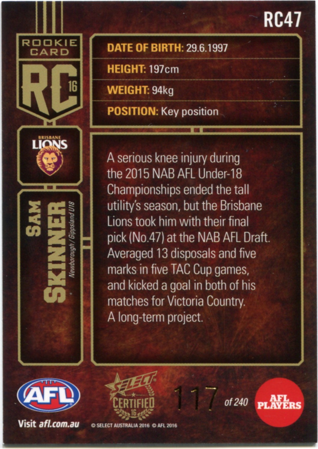 Item: 2016 Select Certified AFL Rookie Card RC47 Sam Skinner 117/240 - Brisbane Lions