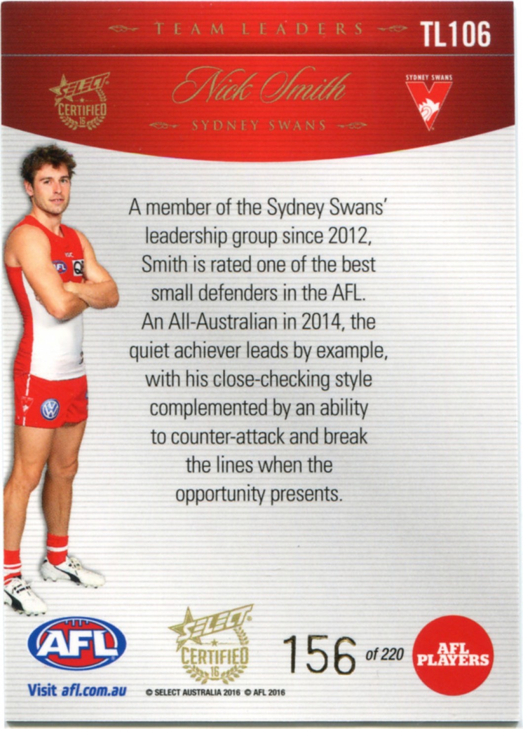 2016 Select Certified AFL Team Leaders TL106 Nich Smith 156/220 - Sydney Swans