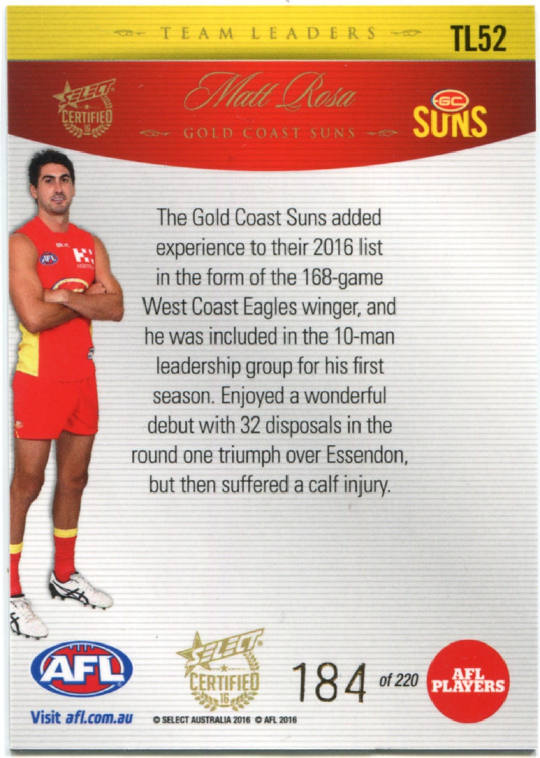 2016 Select Certified AFL Team Leaders TL52 Matthew Rosa 184/220 - Gold Coast Suns