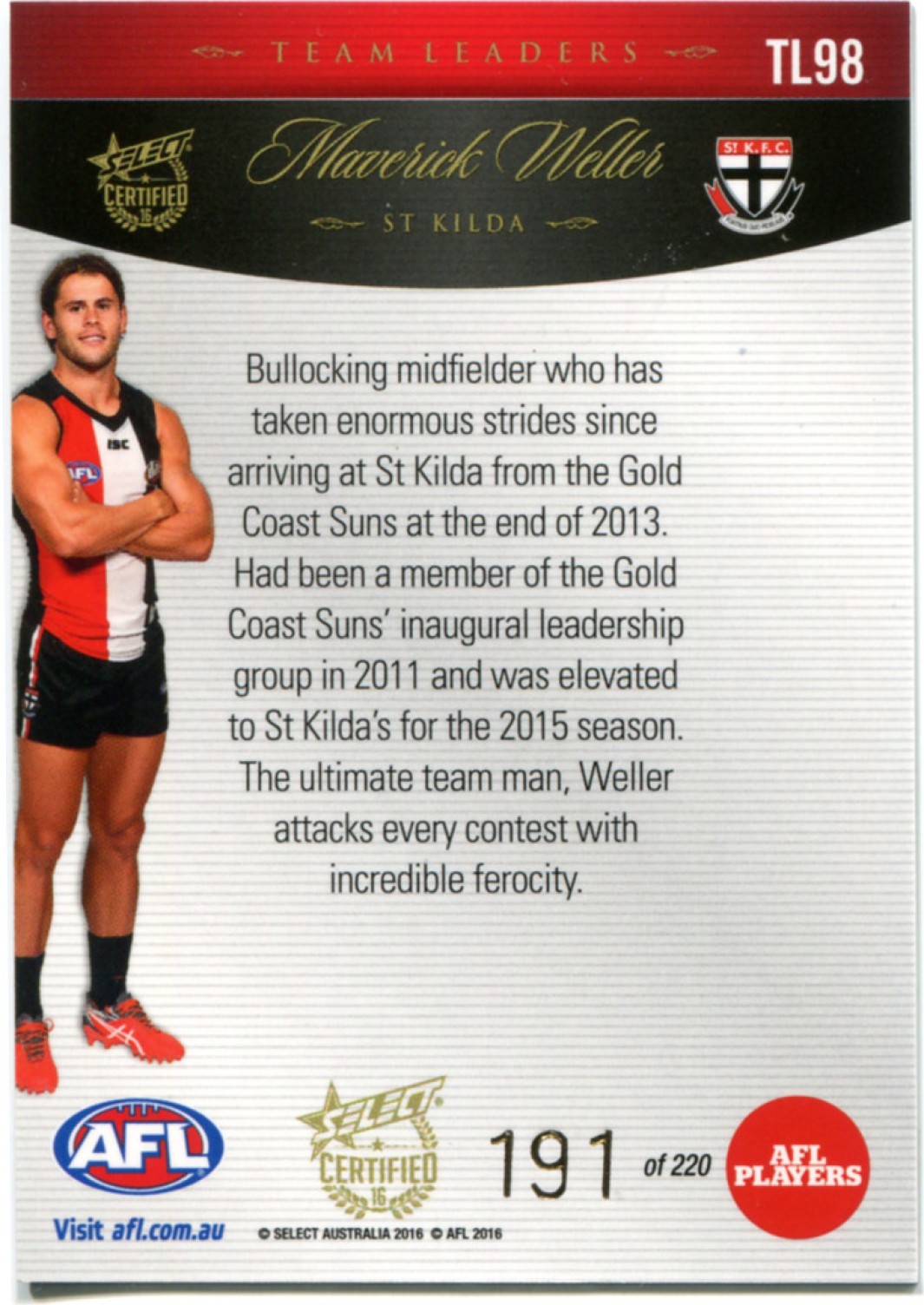 Item: 2016 Select Certified AFL Team Leaders TL98 Maverick Weller 191/220 - St Kilda Saints