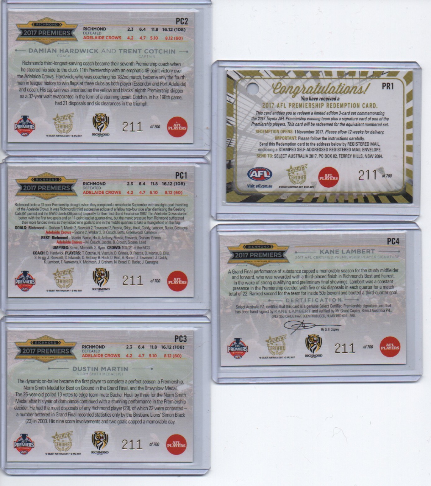 2017 AFL SELECT CERTIFIED PREMIERSHIP SIGNATURE REDEMPTION 5 CARD SET - RICHMOND TIGERS #211