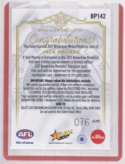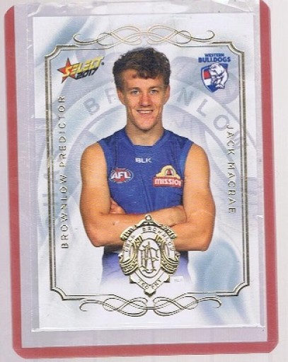 2017 SELECT AFL FOOTY STARS BROWNLOW PREDICTOR CARD - JACK MACRAE WESTERN BULLDOGS