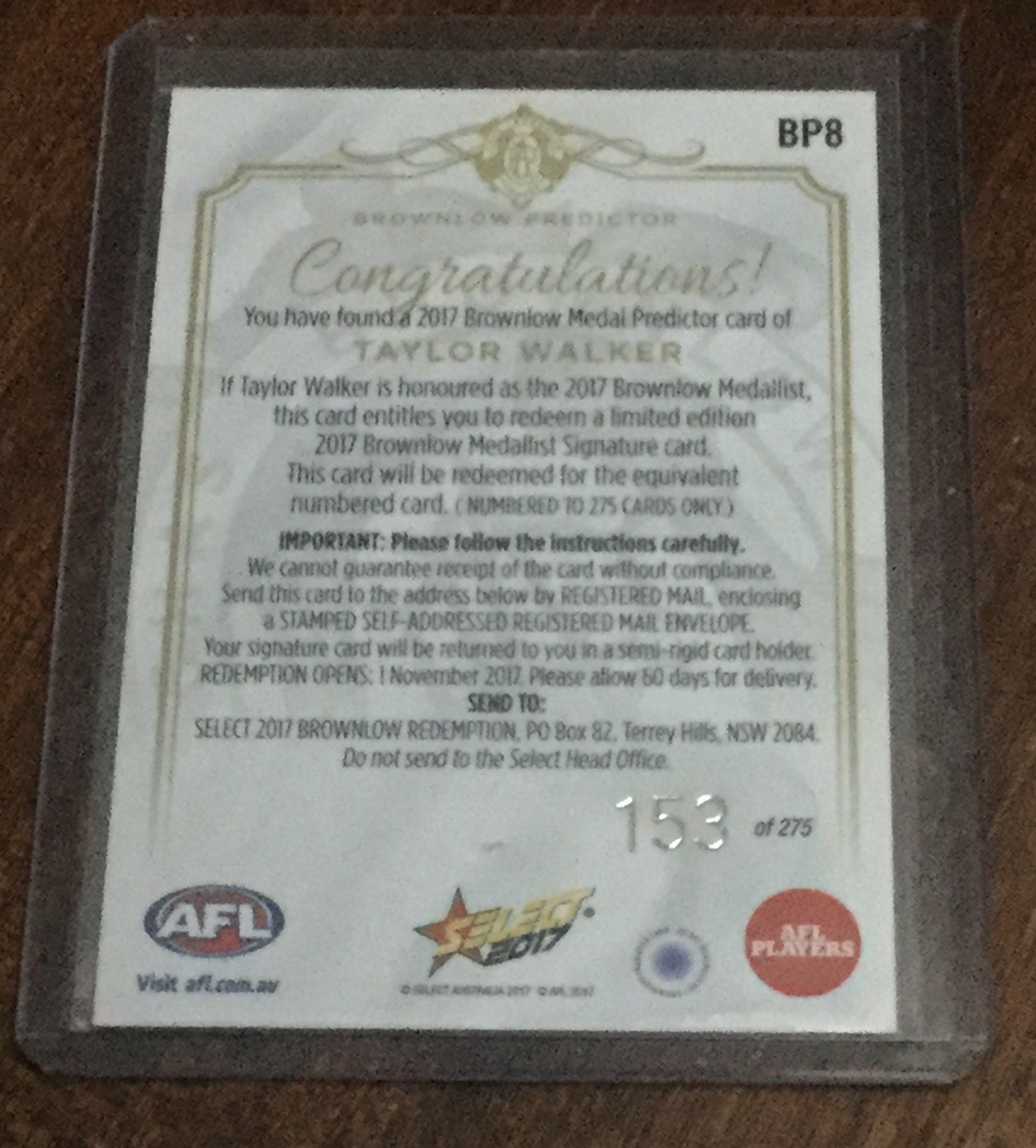 2017 SELECT AFL FOOTY STARS BROWNLOW PREDICTOR CARD