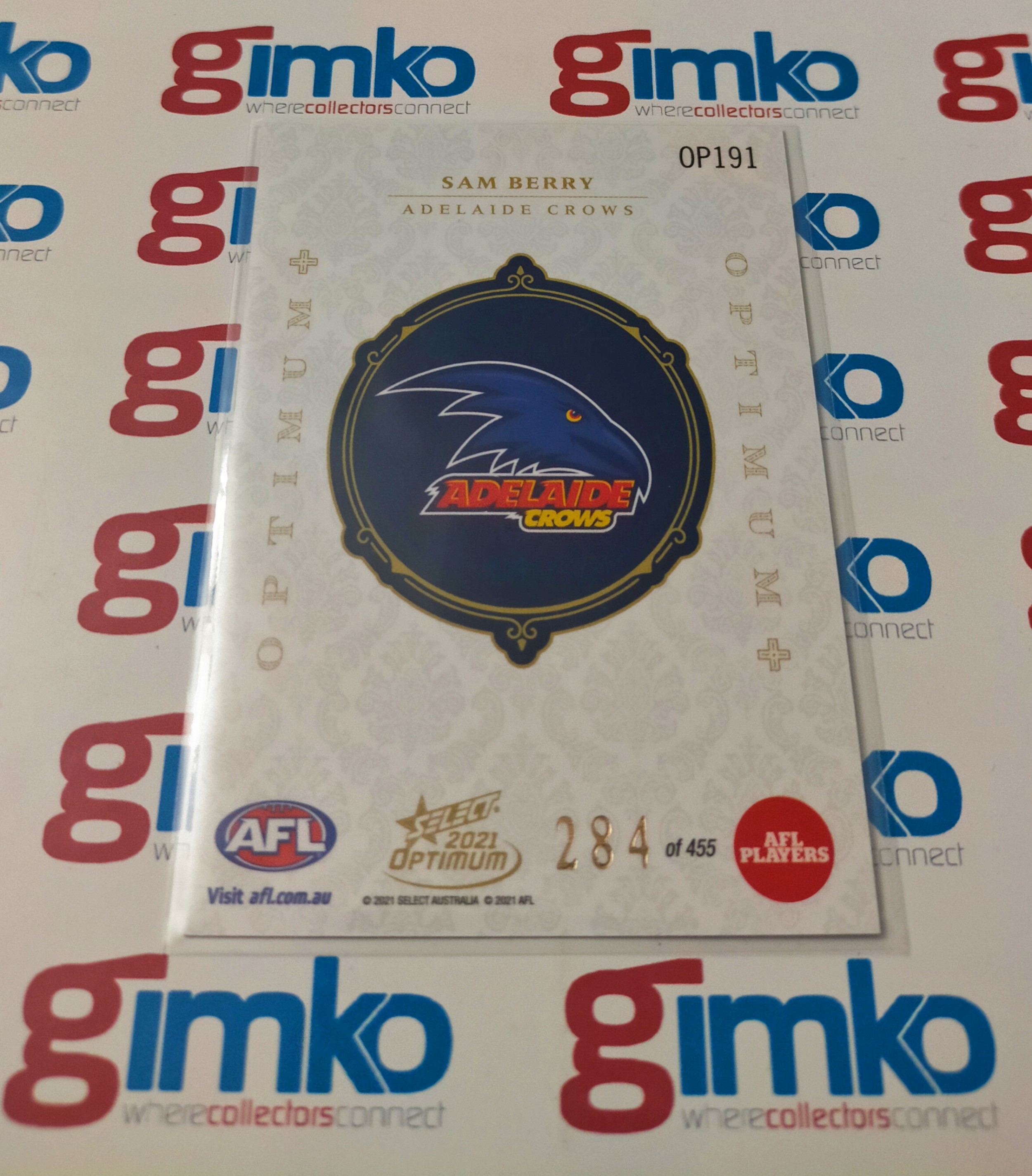 2021 AFL SELECT OPTIMUM OPTIMUM+ ROOKIE CARD OP191 SAM BERRY - ADELAIDE CROWS #284/455 RC