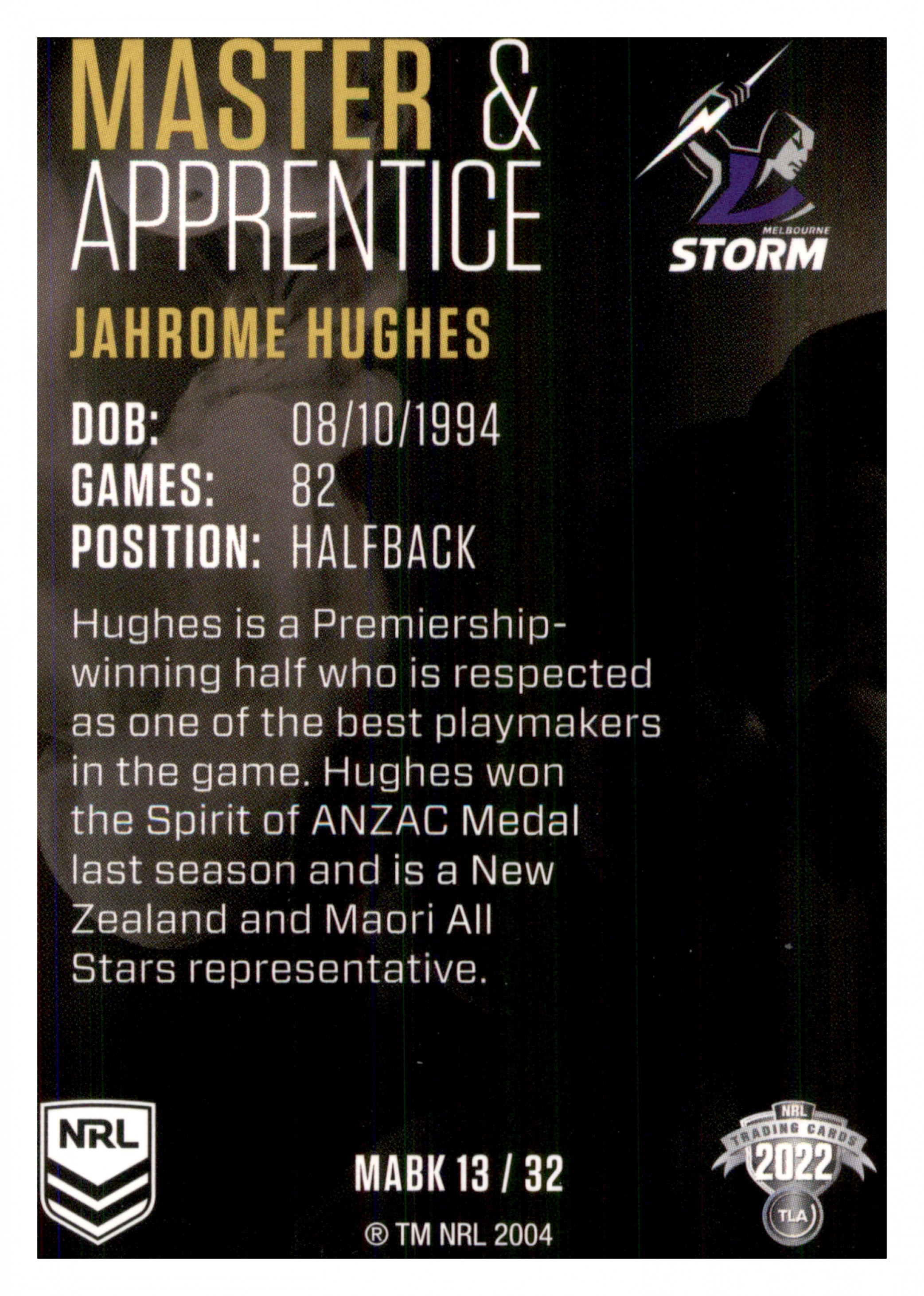 2022 TLA NRL TRADERS MASTER & APPRENTICE BLACK CARD MABK13 JAHROME HUGHES - MELBOURNE STORM