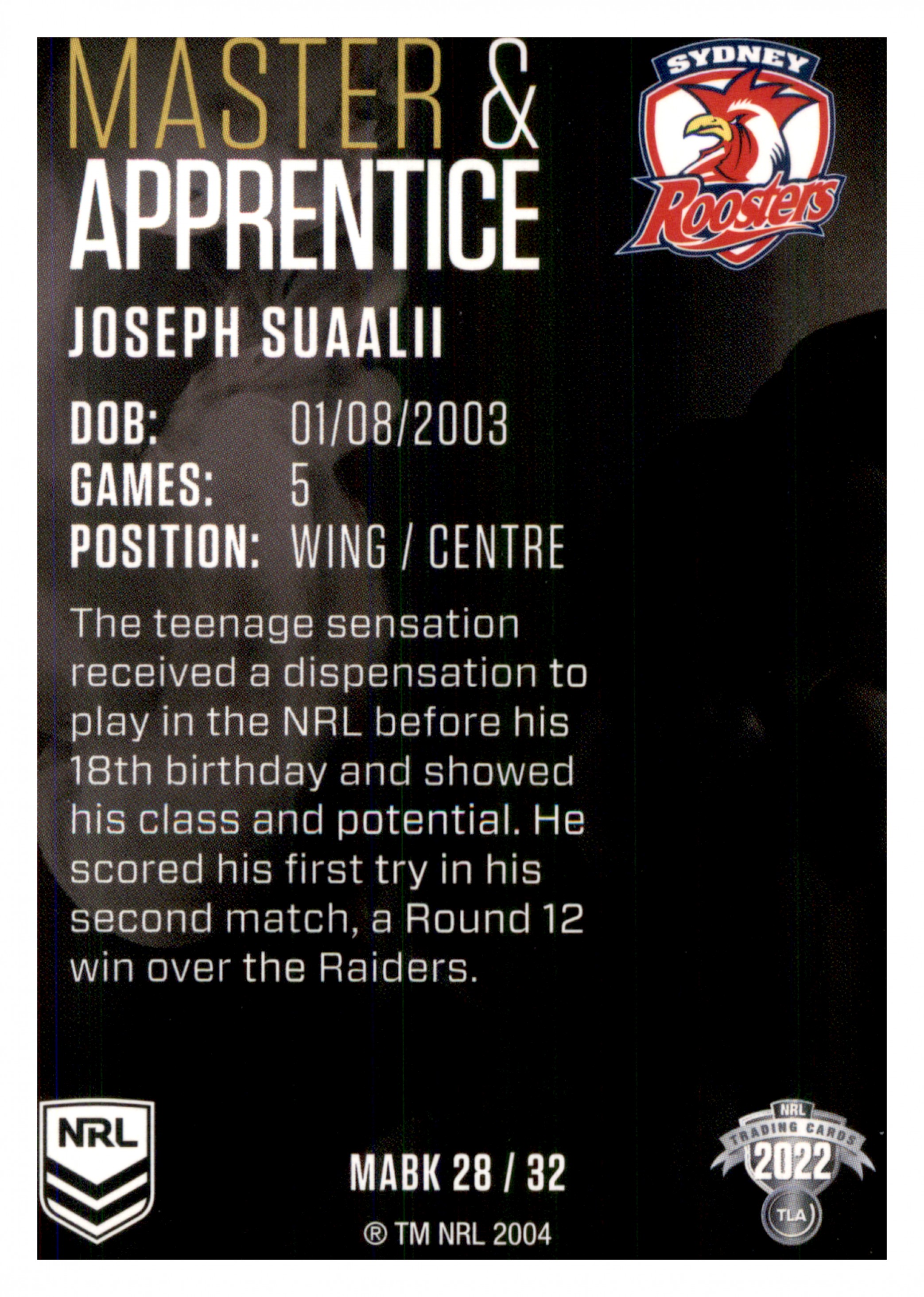 2022 TLA NRL TRADERS MASTER & APPRENTICE BLACK CARD MABK28 JOSEPH SUAALII - SYDNEY ROOSTERS