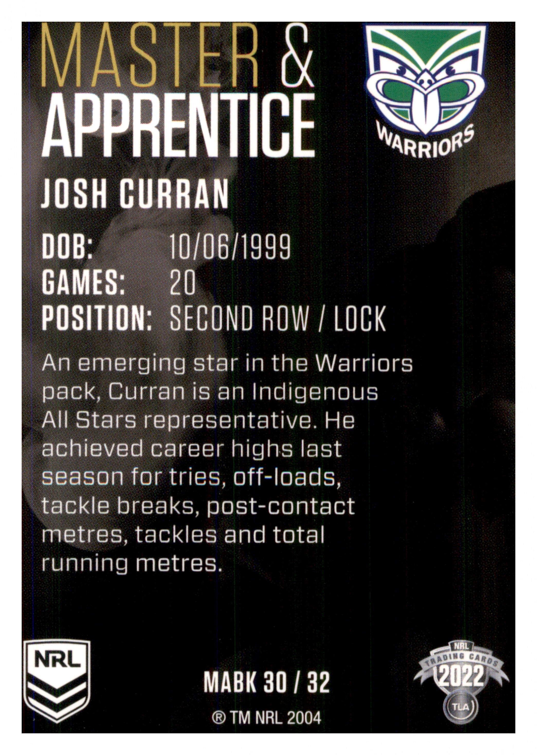2022 TLA NRL TRADERS MASTER & APPRENTICE BLACK CARD MABK30 JOSH CURRAN - NEW ZEALAND WARRIORS