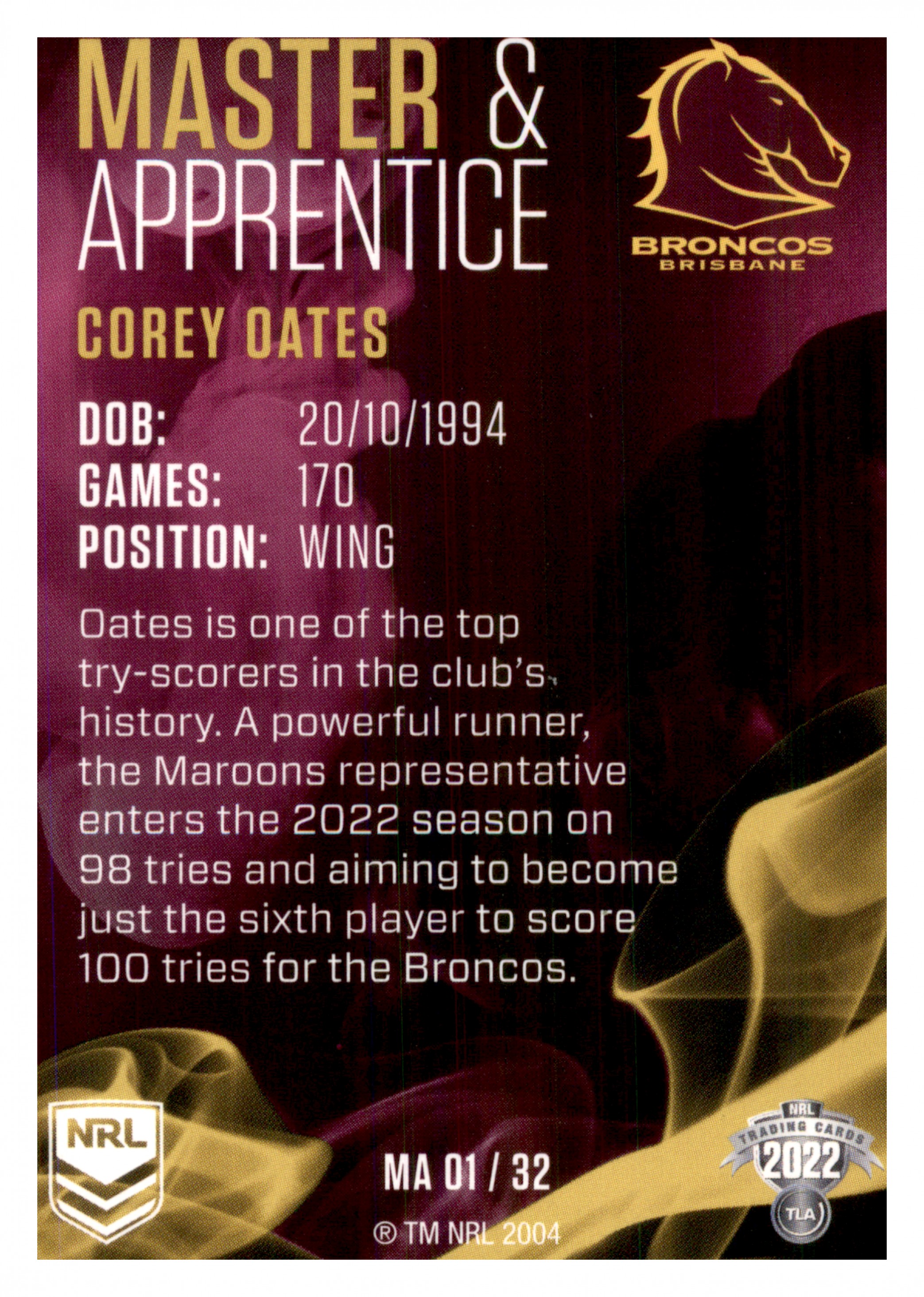 2022 TLA NRL TRADERS MASTER & APPRENTICE CARD MA01 COREY OATES - BRISBANE BRONCOS